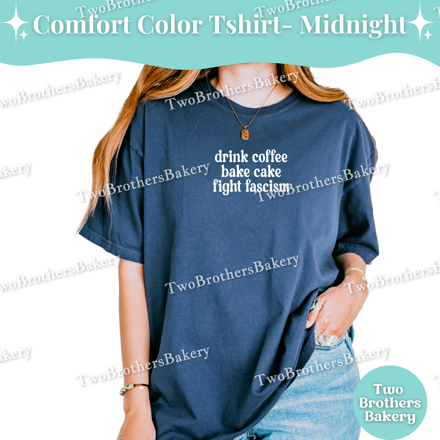 The “Drink Coffee, Bake Cake, Fight Fascism” Comfort Colors® t-shirt blends an effortlessly worn-in feel with a bold, clear statement. Designed for cake bakers who live for early mornings, buttercream-covered counters, and values that matter, this tee celebrates the everyday rhythm of cake life—coffee brewing, layers stacking, crumbs everywhere, and showing up as your authentic self. The clean white typography stands out beautifully against rich garment colors, making the message feel confident, intentional, and easy to wear.