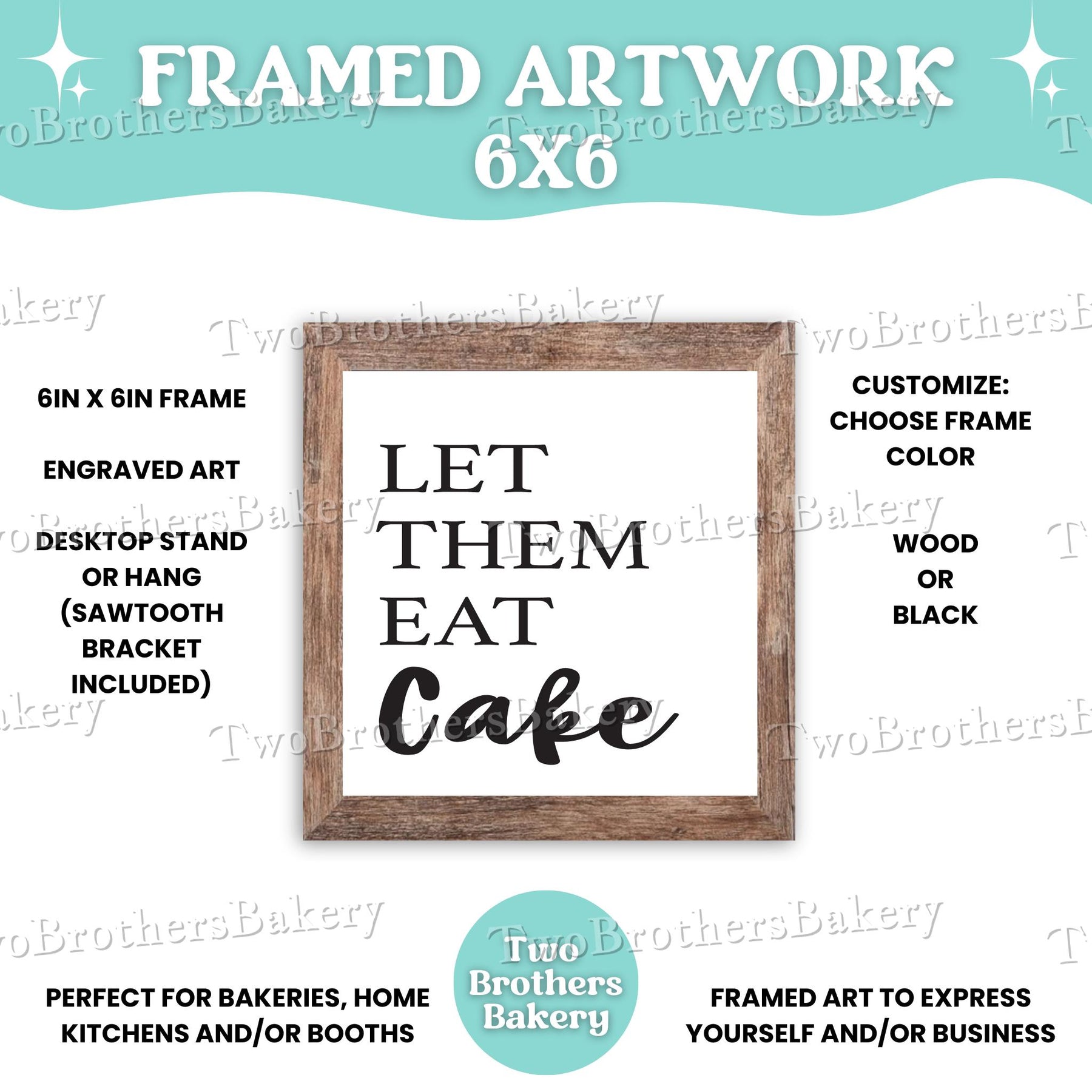 Because cake is always the answer! This 6x6 framed baking décor brings a touch of elegance and history to your space with the timeless phrase "Let Them Eat Cake." Featuring a modern print font for the first three words and a rustic cursive font for "Cake," this sign blends simplicity and charm, making it a perfect addition to any home kitchen, cottage bakery, vendor booth, or brick-and-mortar shop.