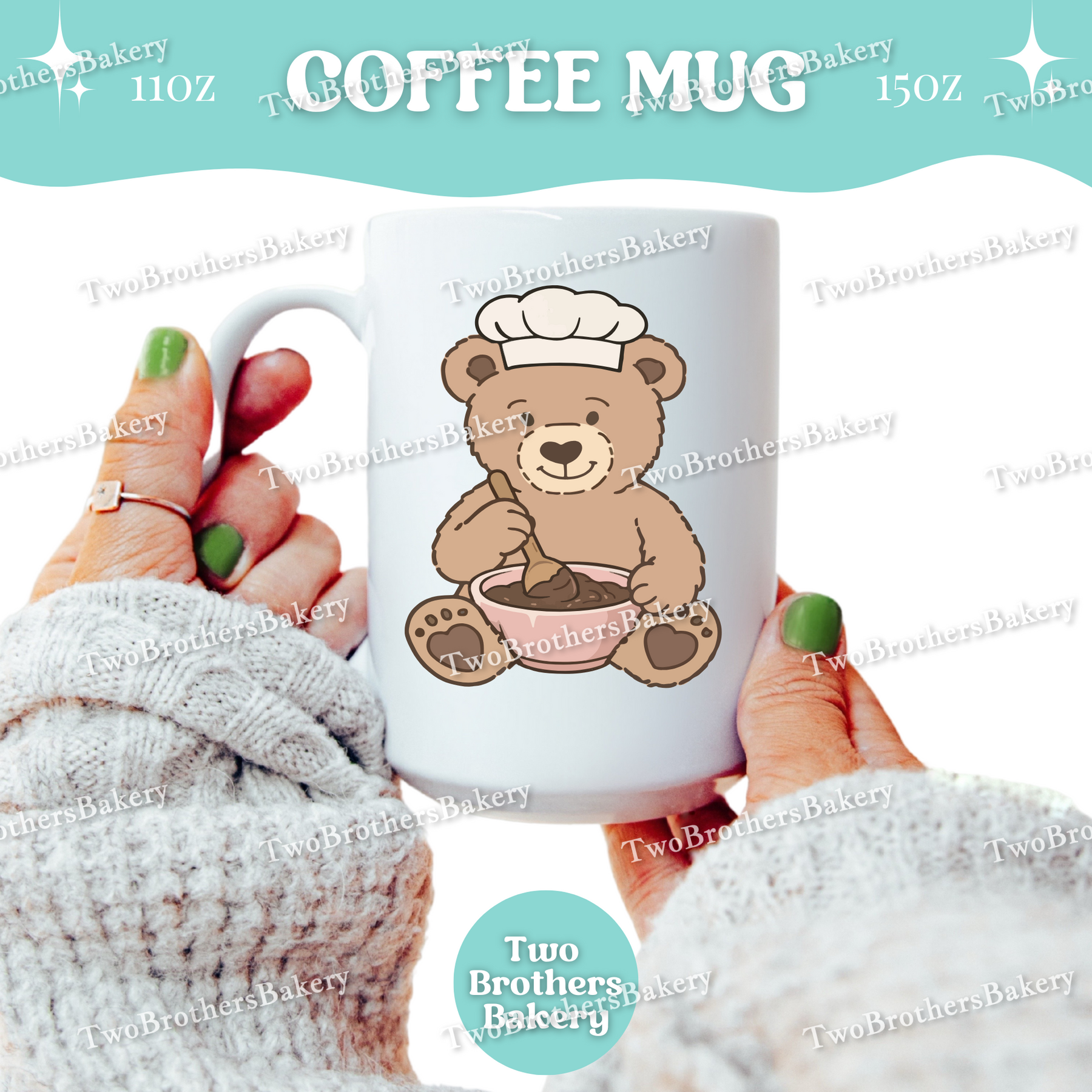 Available in 11oz or 15oz, this mug features a comfortable C-handle and is microwave and dishwasher safe, making it as practical as it is cute. Whether it’s filled with coffee, tea, or hot cocoa, this mug is the perfect companion for mixing batter, packing orders, or enjoying a quiet moment before the oven timer goes off.