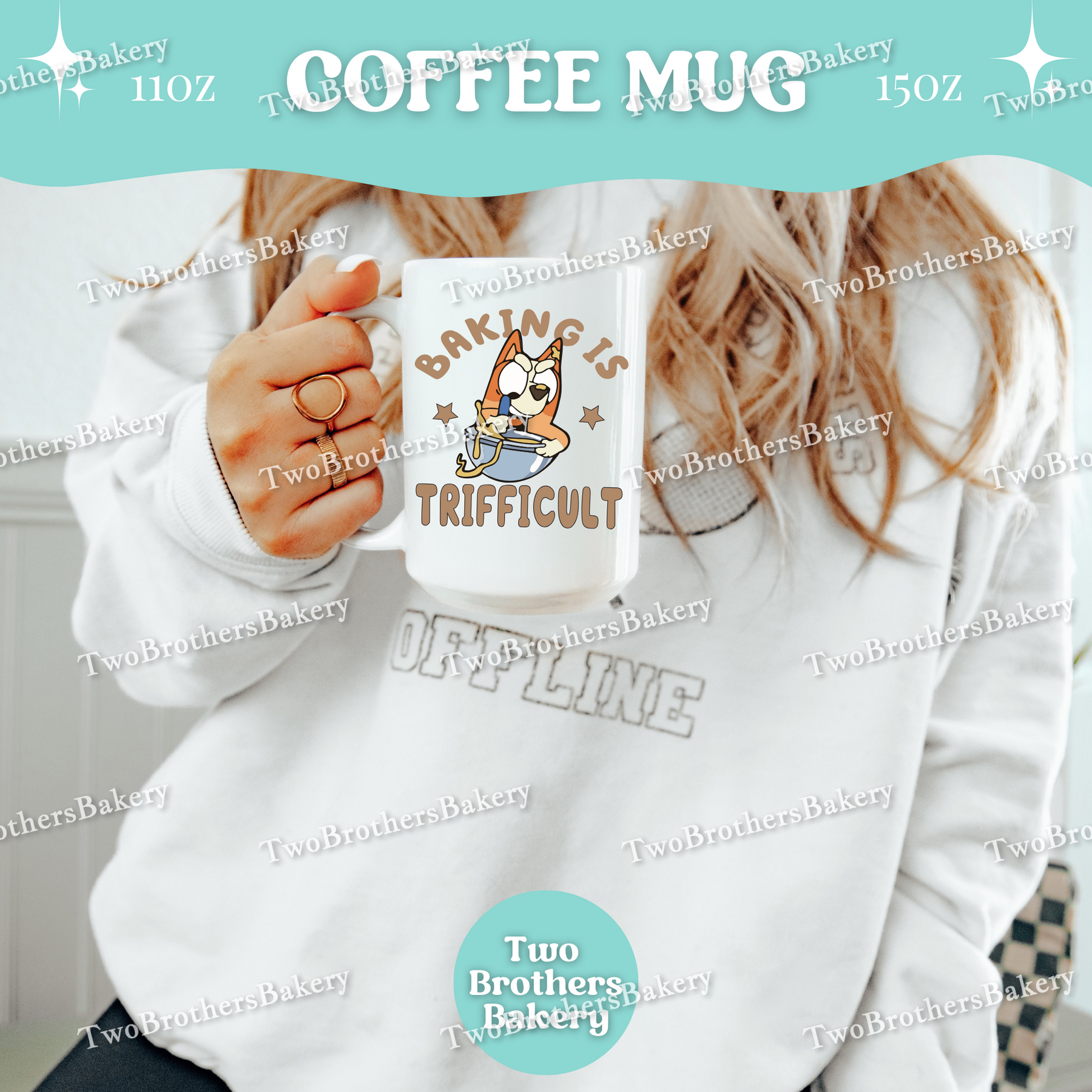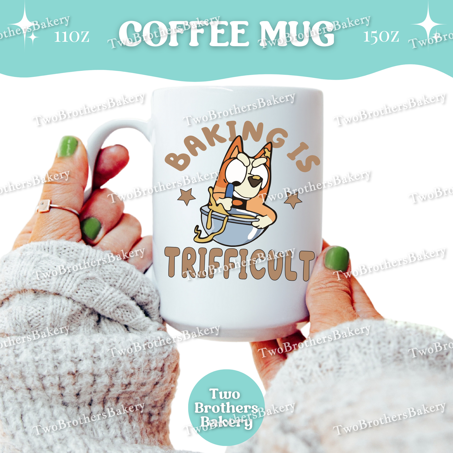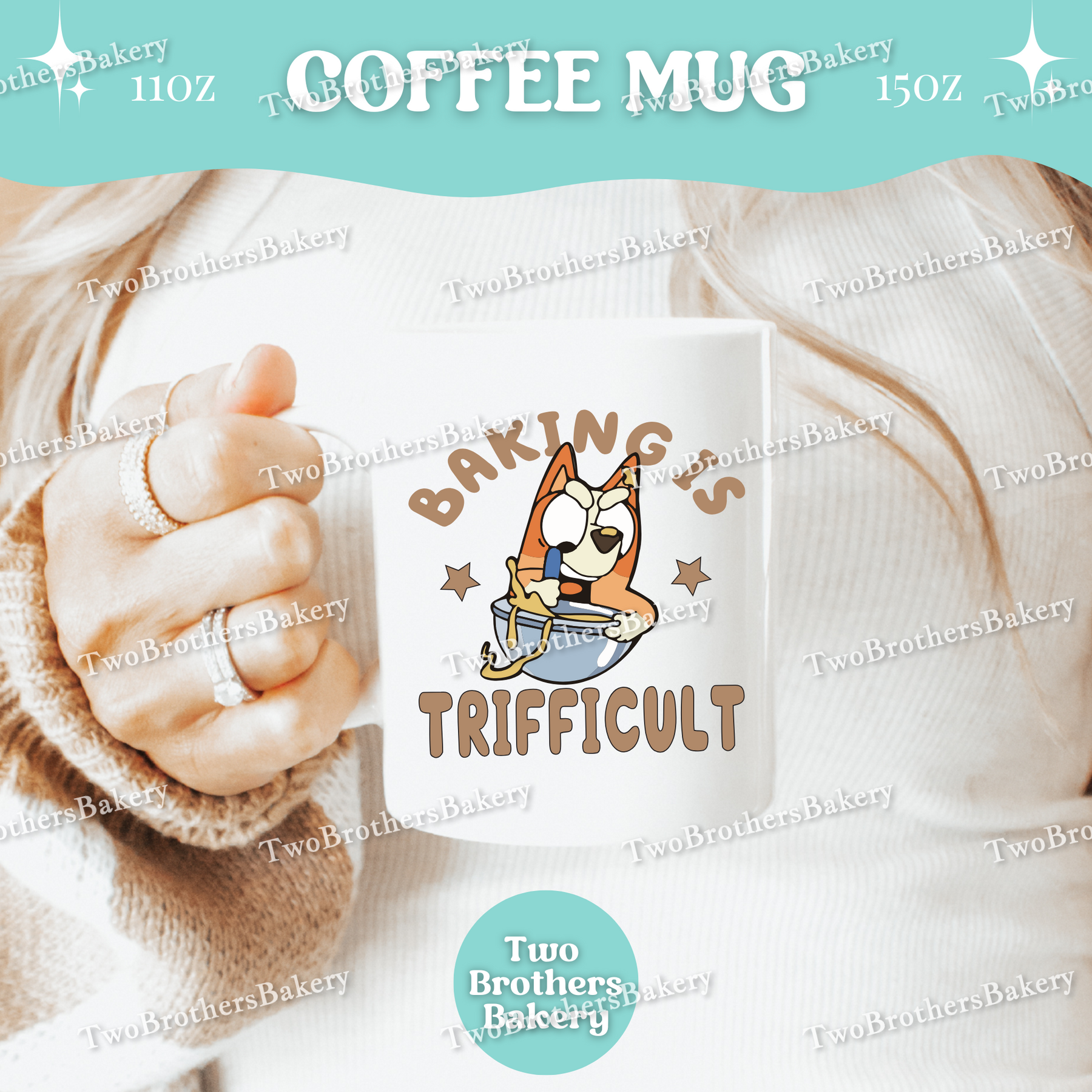 Playful, relatable, and made for the beautifully chaotic baking days, this “Baking’s Trifficult” Mug is a lighthearted nod to the real-life juggle of mixing, parenting, and keeping it all together. Inspired by a certain iconic mispronunciation loved by parents everywhere, this design puts a fun baking twist on a moment that instantly resonates with anyone deep in their mom era, Bluey era, and baking era all at once.