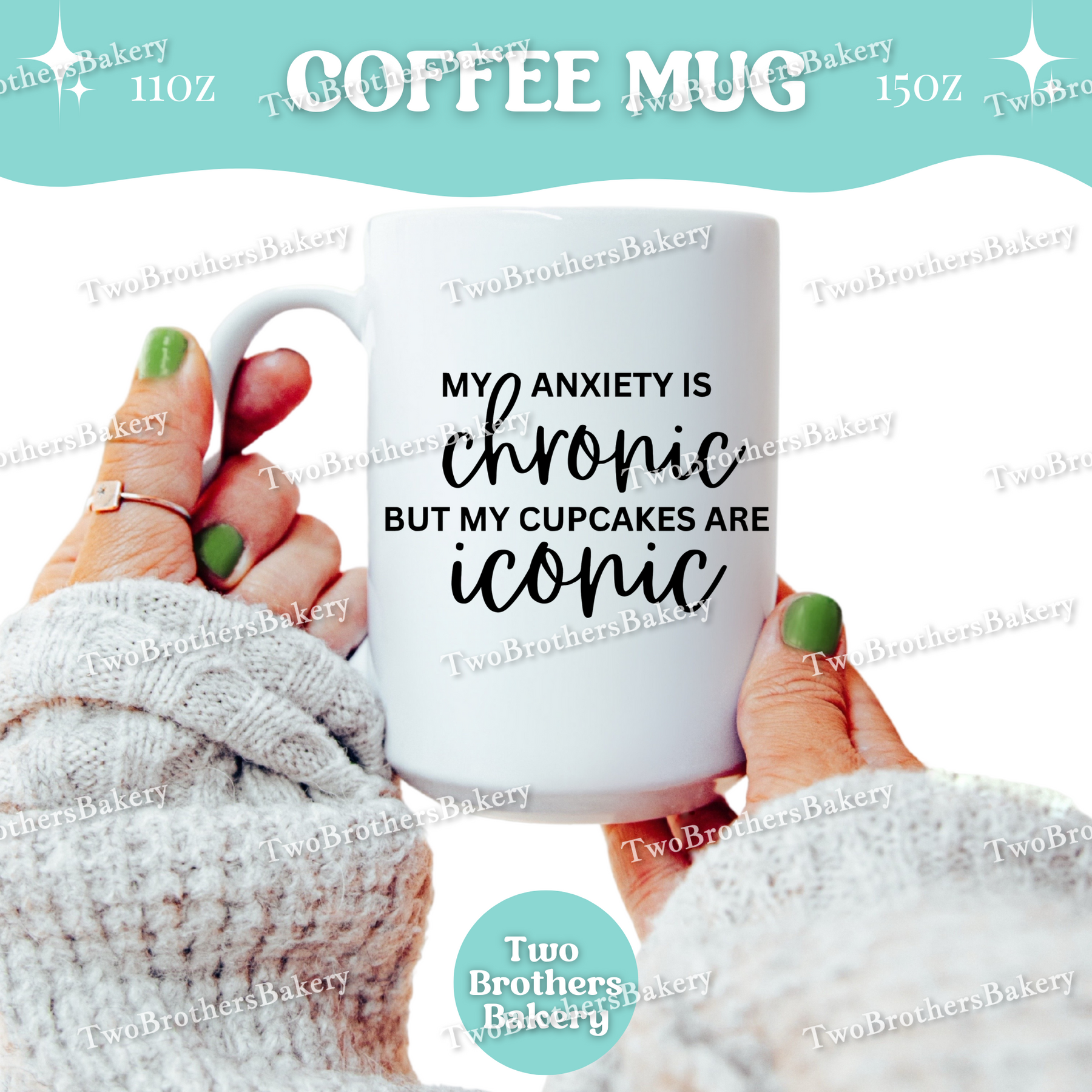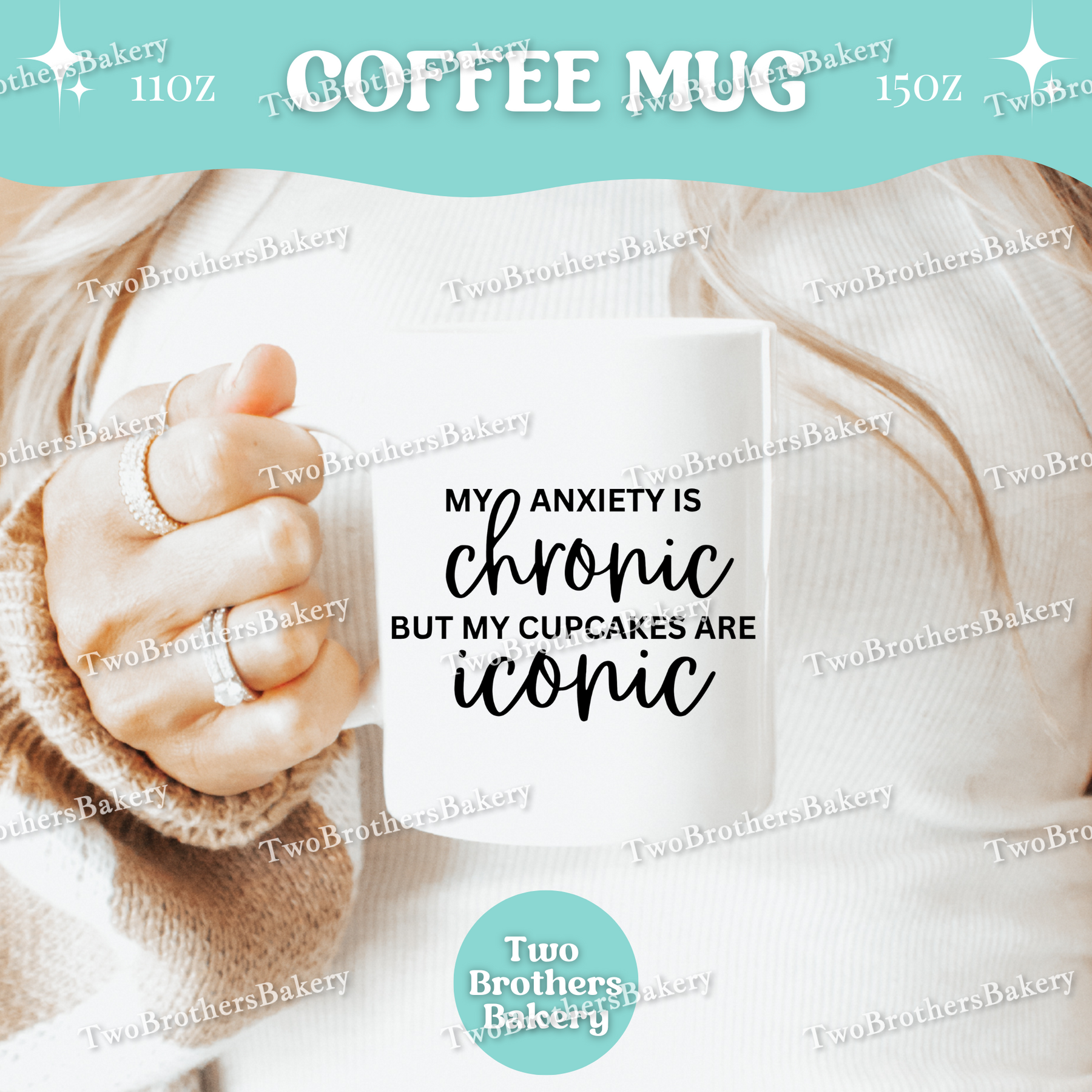 Featuring the phrase “My anxiety is chronic, but my cupcakes are iconic,” this design blends honesty, humor, and pride in your craft. It’s a lighthearted nod to mental health with a baking twist—perfect for cupcake bakers who pour their energy, creativity, and feelings straight into their work (and their frosting).