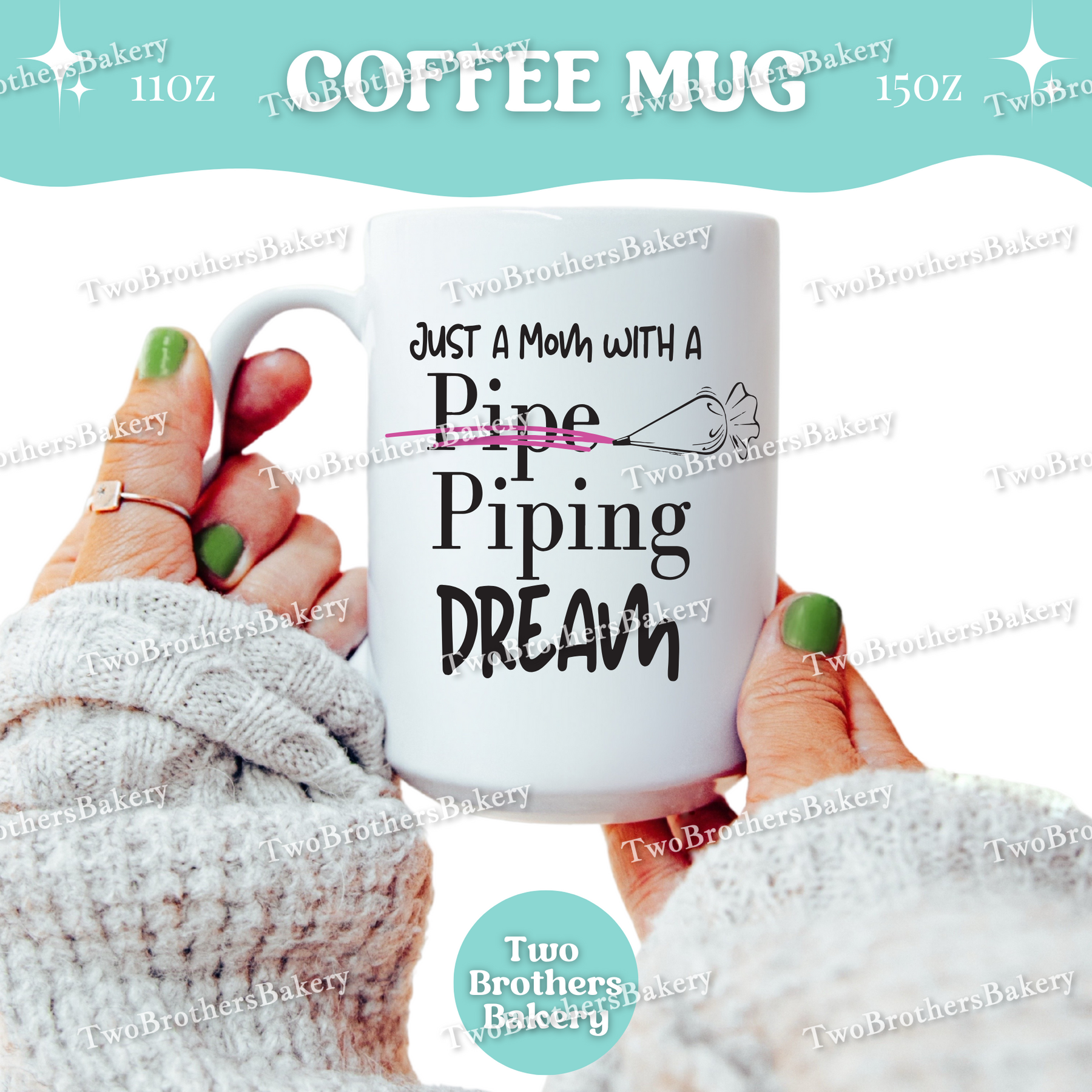 Featuring the phrase “Just a mom with a piping dream” (because pipe dreams are overrated), this design celebrates ambition, creativity, and the courage it takes to build something sweet from scratch. Whether she’s baking during nap time, after bedtime, or before the sun comes up, this mug is a reminder that her dream matters.