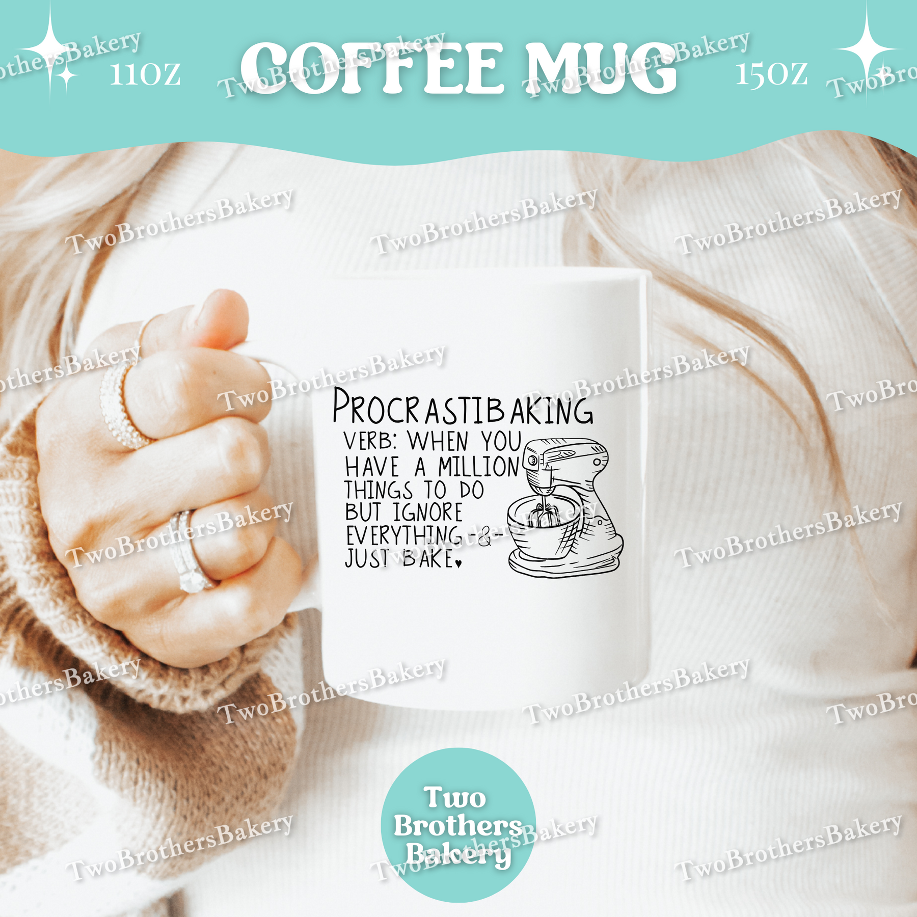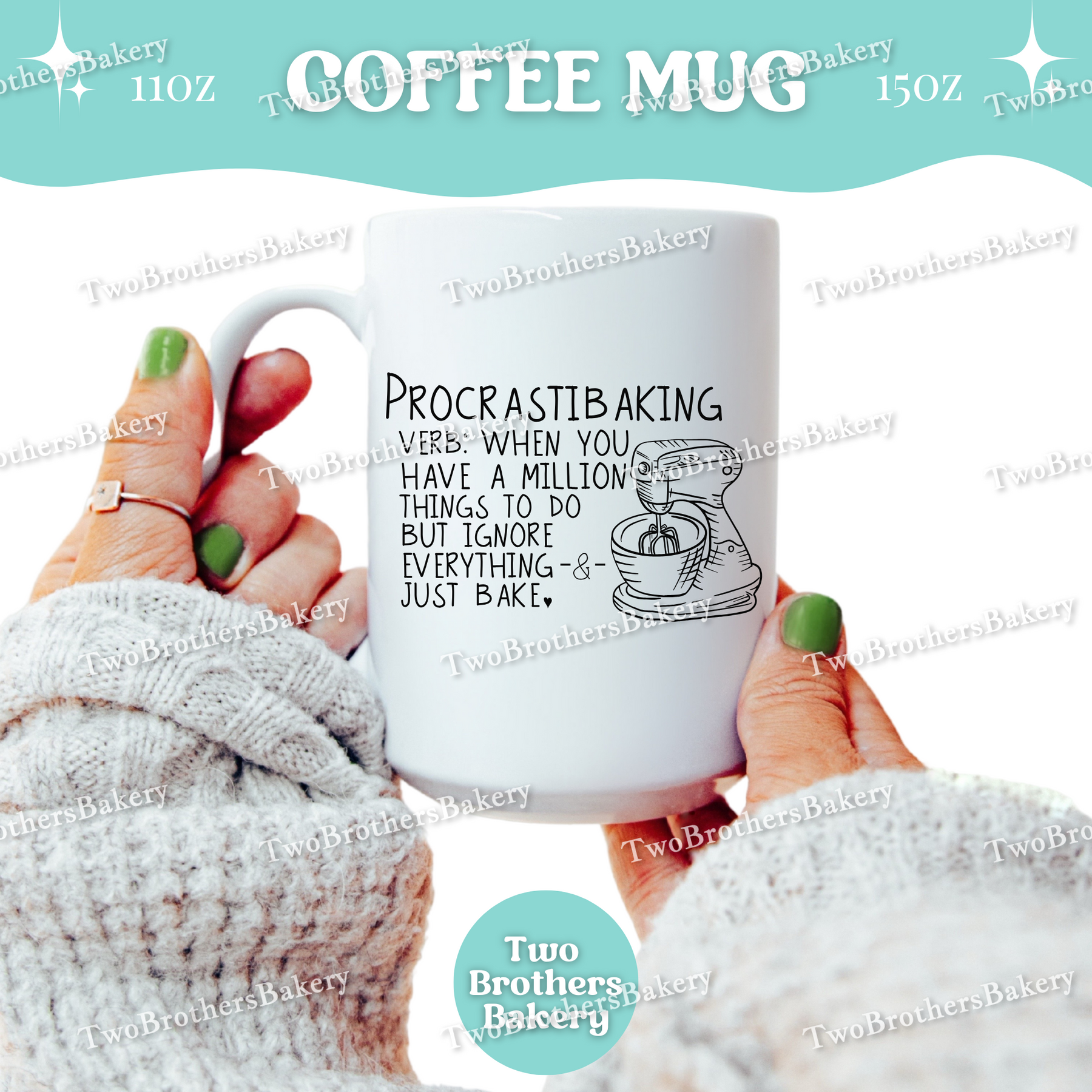 Made from classic white ceramic, the design is sublimated directly into the mug for a smooth, permanent finish that won’t peel, crack, or fade. It’s microwave and dishwasher safe, making it perfect for everyday use—especially during those long baking detours. Finished with a comfortable C-handle for easy sipping while multitasking (or avoiding tasks altogether).