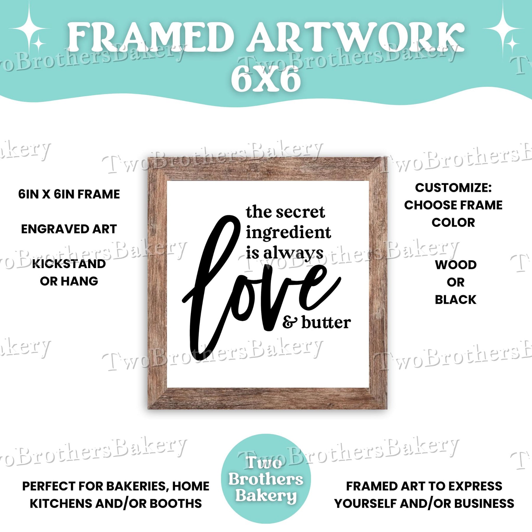 Celebrate the heart and soul of baking with this charming and heartfelt framed art. Featuring the phrase "The Secret Ingredient is Always Love and Butter," this sign is the perfect reminder of what makes every recipe truly special. Ideal for home kitchens, bakeries, and vendor displays, this artwork adds a touch of warmth and personality to any space.