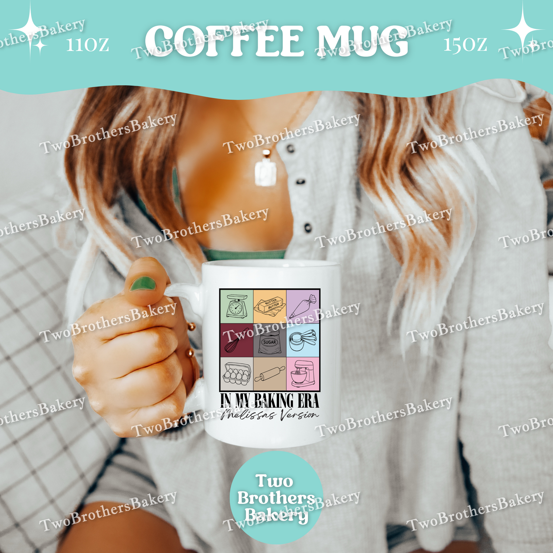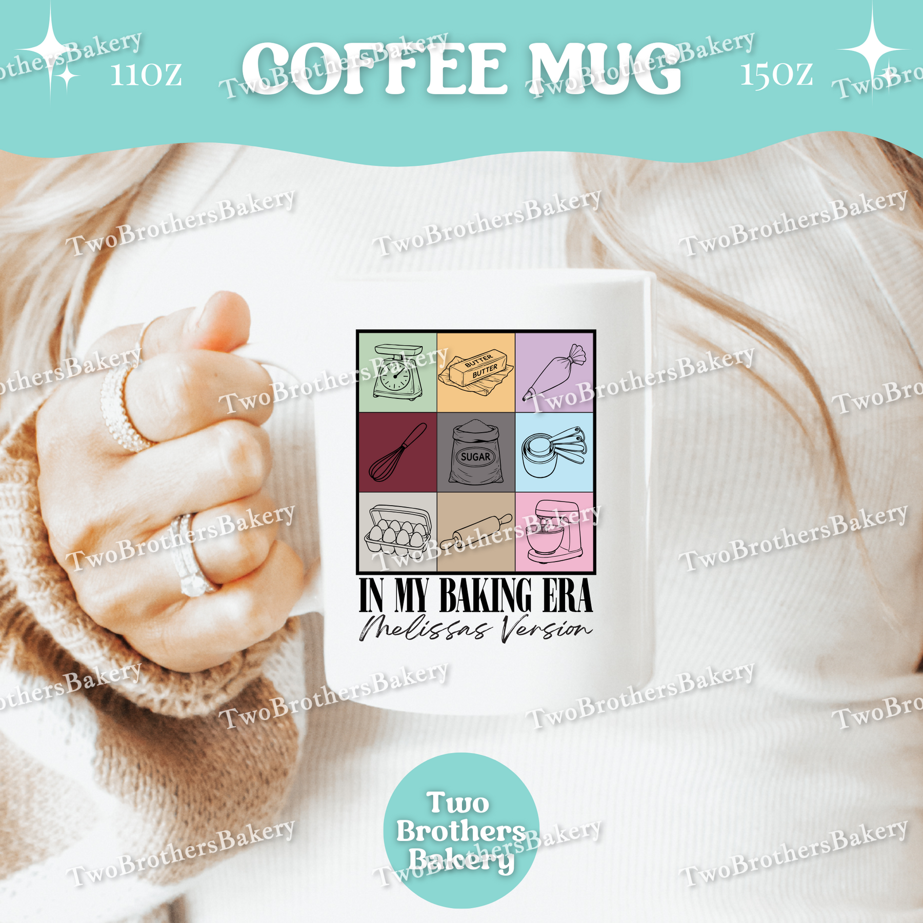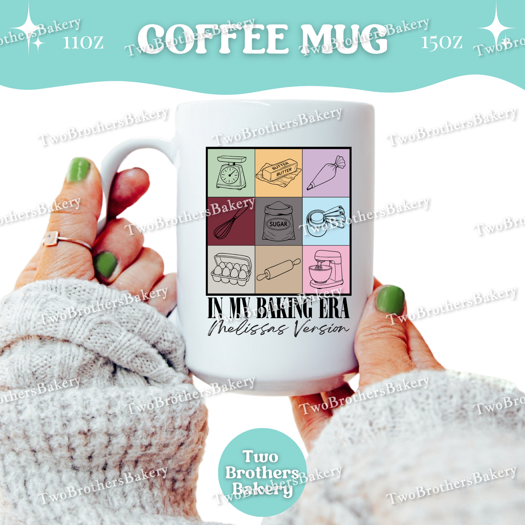 Inspired by iconic concert-era aesthetics (with a fun baking twist), this coffee mug features a grid-style design of baking tools and ingredients, paired with the phrase “In My Baking Era” and a personalized line underneath that reads “[Your Name]’s Version” in a distressed, marker-style font.