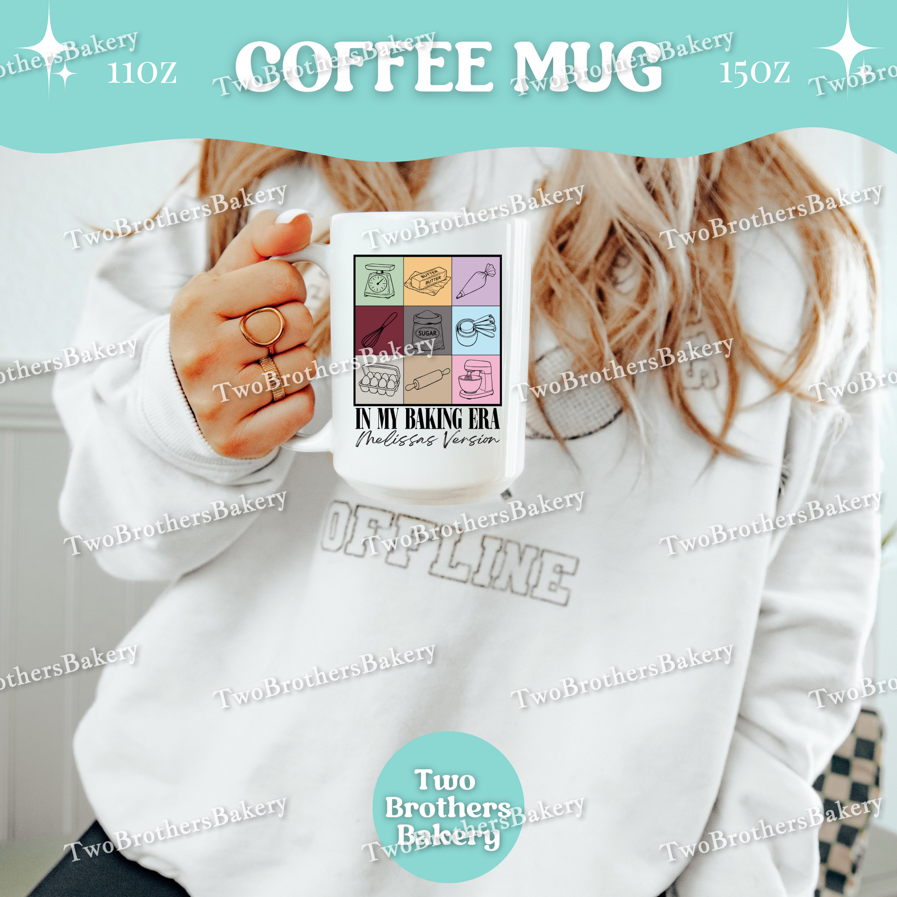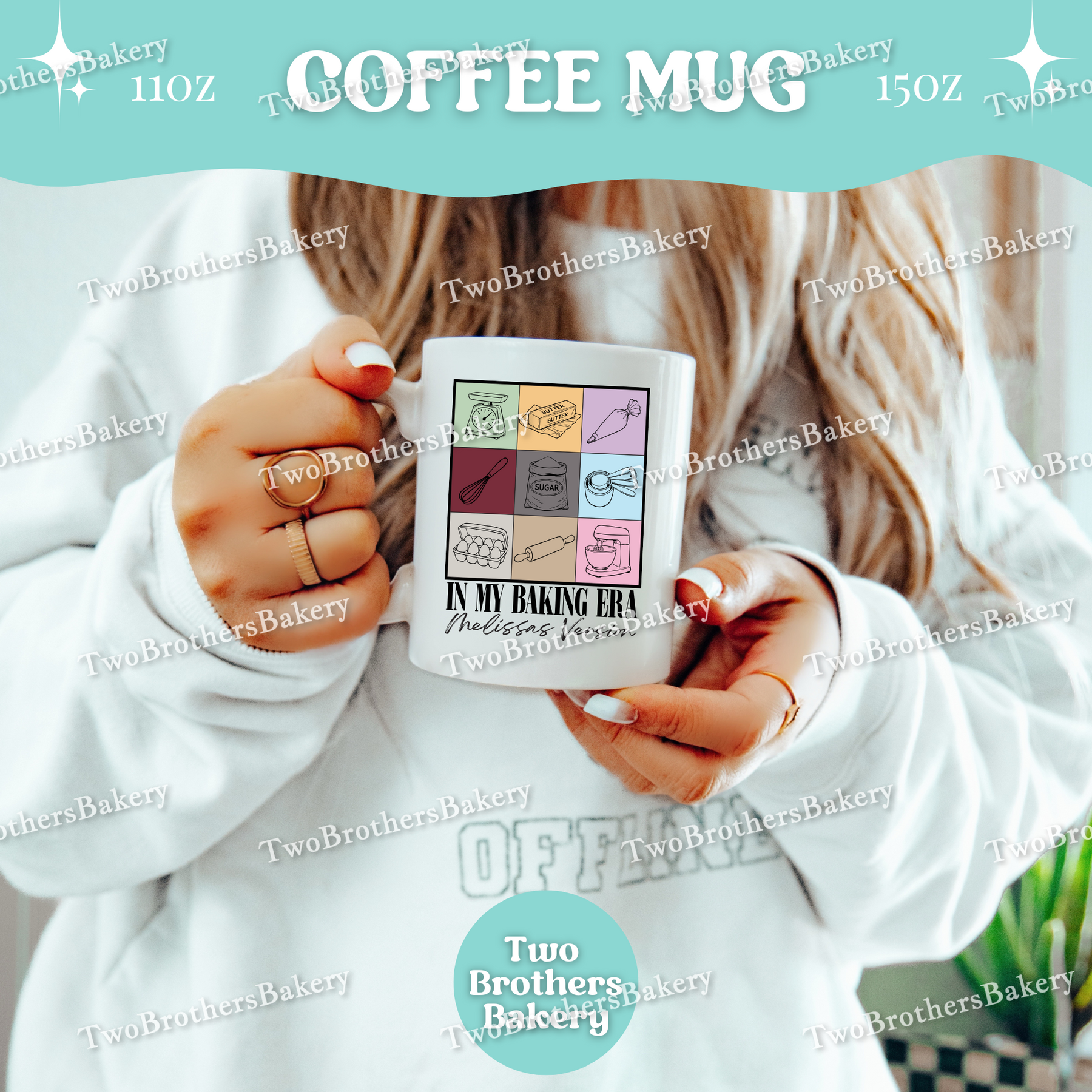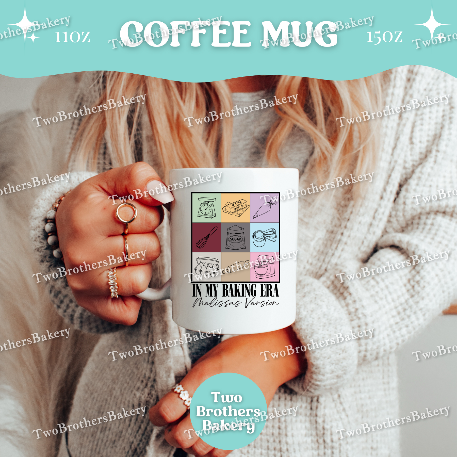Inspired by iconic concert-era aesthetics (with a fun baking twist), this coffee mug features a grid-style design of baking tools and ingredients, paired with the phrase “In My Baking Era” and a personalized line underneath that reads “[Your Name]’s Version” in a distressed, marker-style font.