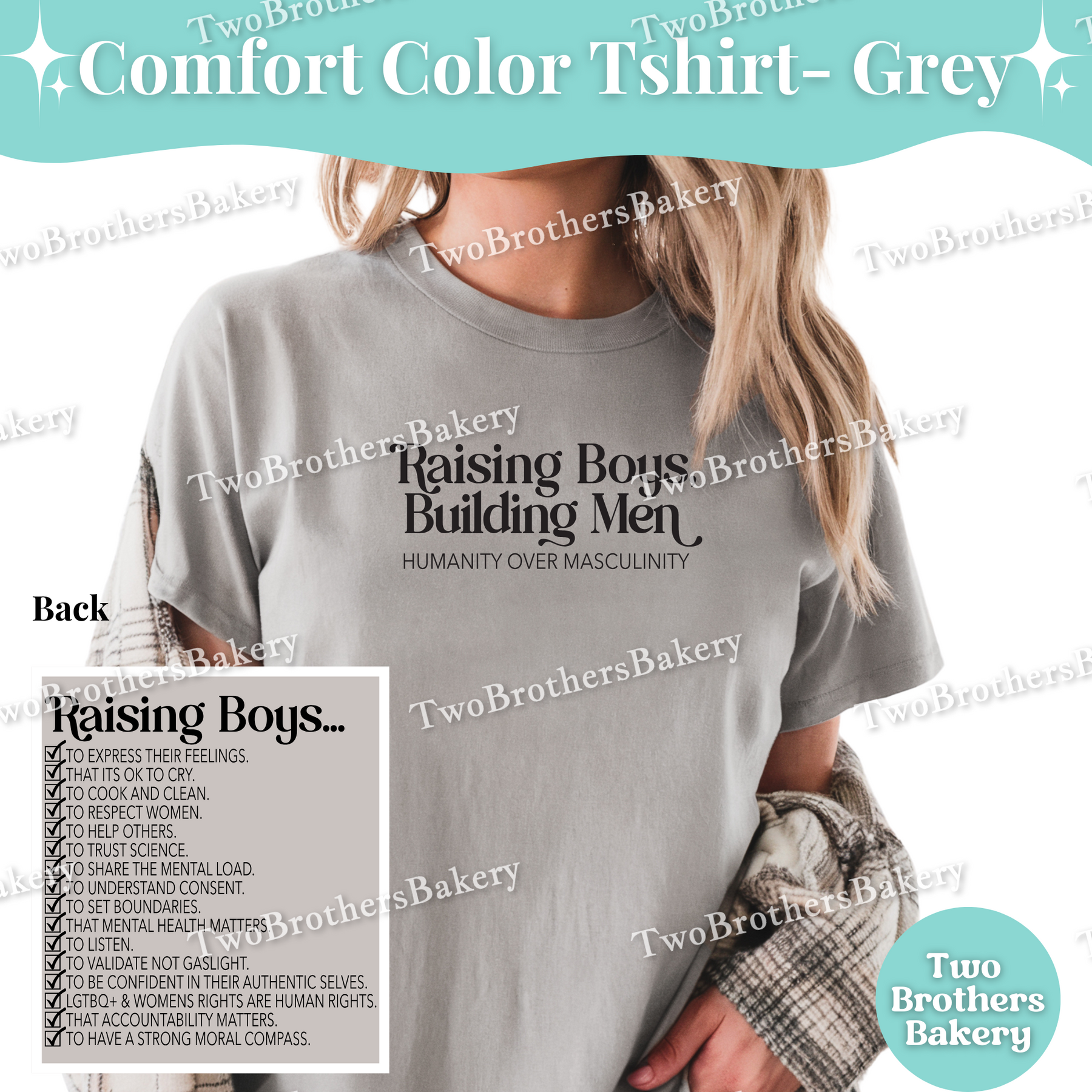 Made from 100% ring-spun cotton, this unisex tee is soft, durable, and effortlessly stylish. The front features the bold phrase “Raising Boys, Building Men” with “Humanity Over Masculinity” below, while the back lists powerful reminders of what raising good men truly means — to be empathetic, respectful, accountable, and kind.
