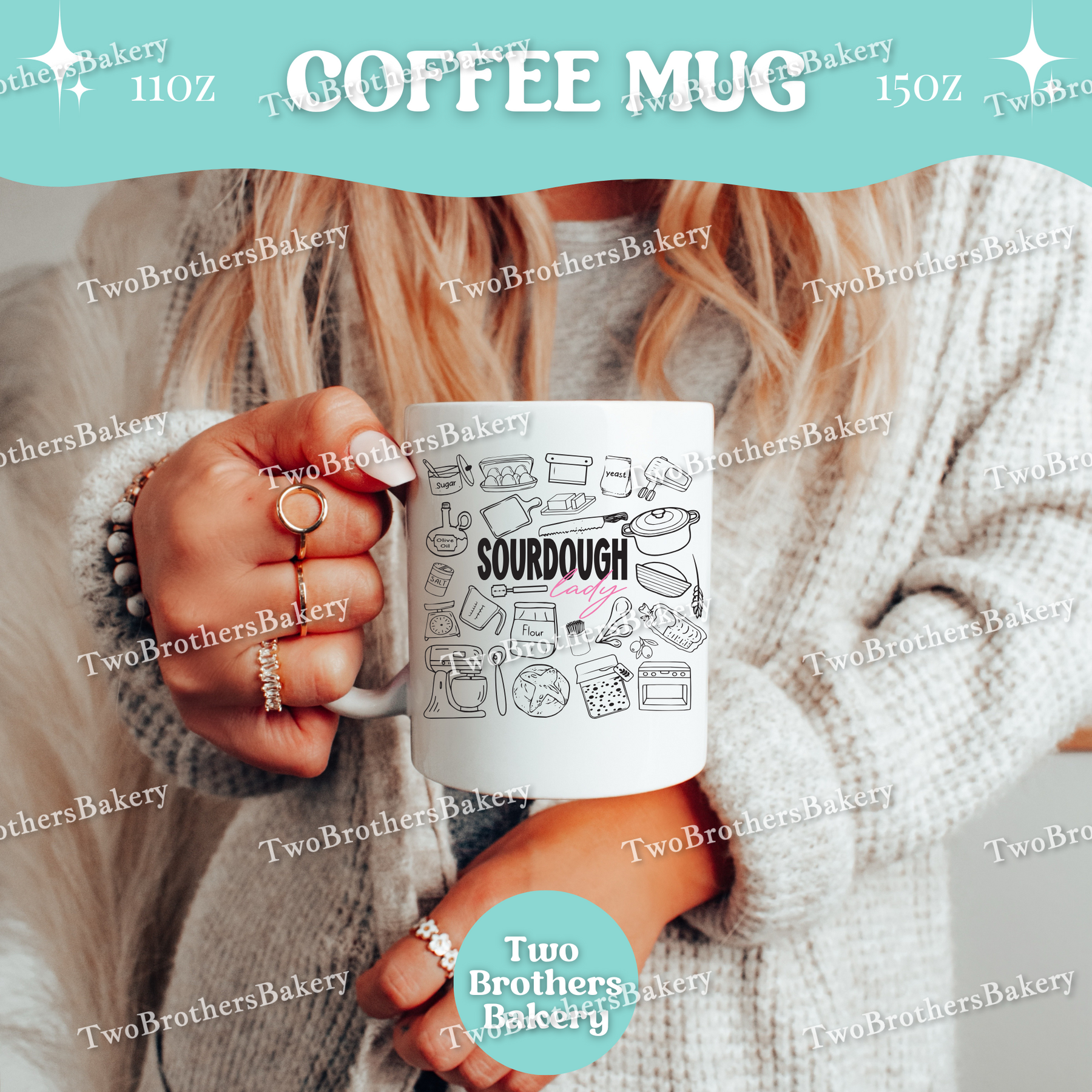 The Sourdough Lady dual-sided mug celebrates the art, patience, and personality behind every great loaf. One side features a bold Sourdough Lady statement with a playful, feminine script accent. Flip it around and you’ll find a detailed, hand-drawn collage of sourdough tools and ingredients—starter jar, flour, scale, mixer, banneton, Dutch oven, and more—because real sourdough love is in the details.