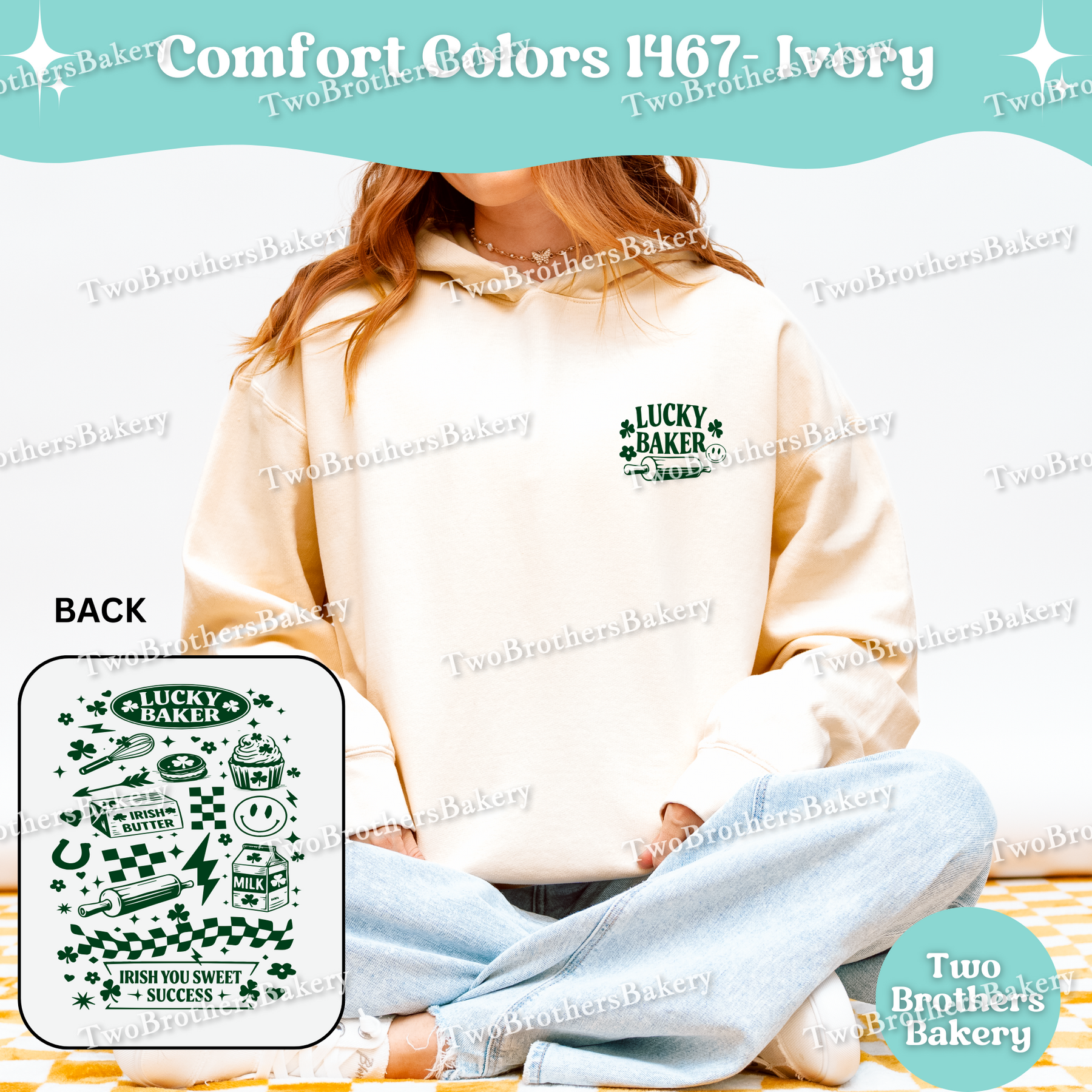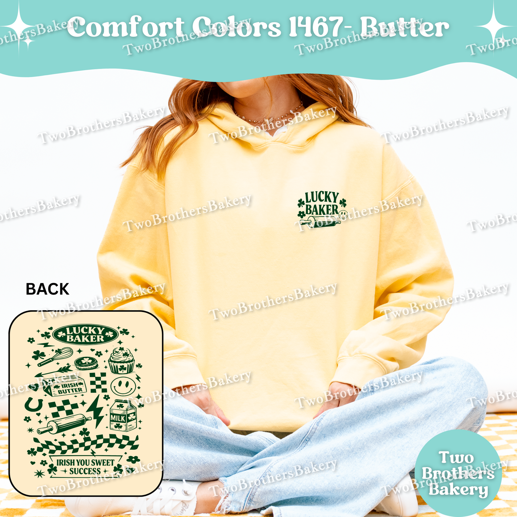The Retro “Not Lucky” baking hoodie is a bold, vintage-inspired celebration of baker grit, humor, and St. Patrick’s Day flair. Designed with a small pocket-size graphic on the front and a full, statement-making illustration on the back, this hoodie is packed with playful details that tell a story. The all–dark green artwork features a nostalgic mix of smiley faces, lightning bolts, daisies, checkered waves, four-leaf clovers, baking tools, ingredients, and Irish-inspired baking puns, giving it a retro sticker-collage vibe that feels fun, expressive, and unapologetically baker-forward.