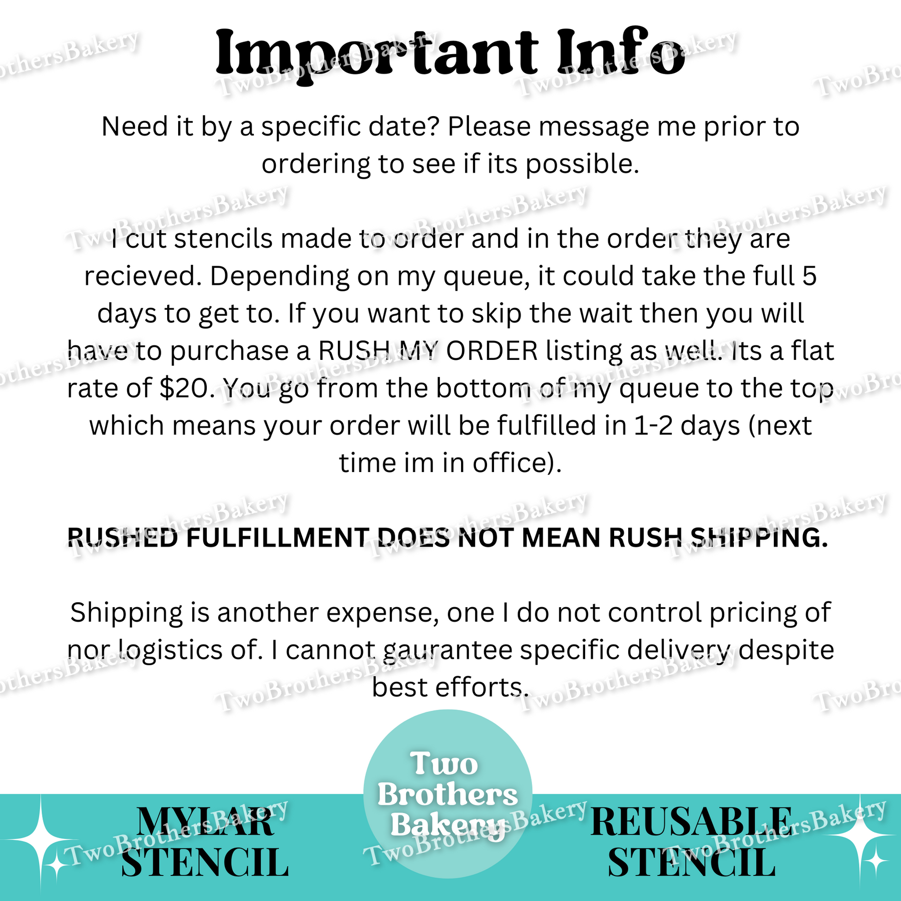 We do not control shipping times. Once your order is dropped off, it’s out of our hands. Expedited shipping does not mean expedited fulfillment. To speed up processing, add the "RUSH MY ORDER" listing to your cart before checkout. Adding that listing means your order goes from the bottom of the queue to the top and will be cut within 1-2 days (next time I'm in office). Only valid for stencil orders. One Rush per order (not per a stencil). Message me prior to purchase if you need info or timing assurance.