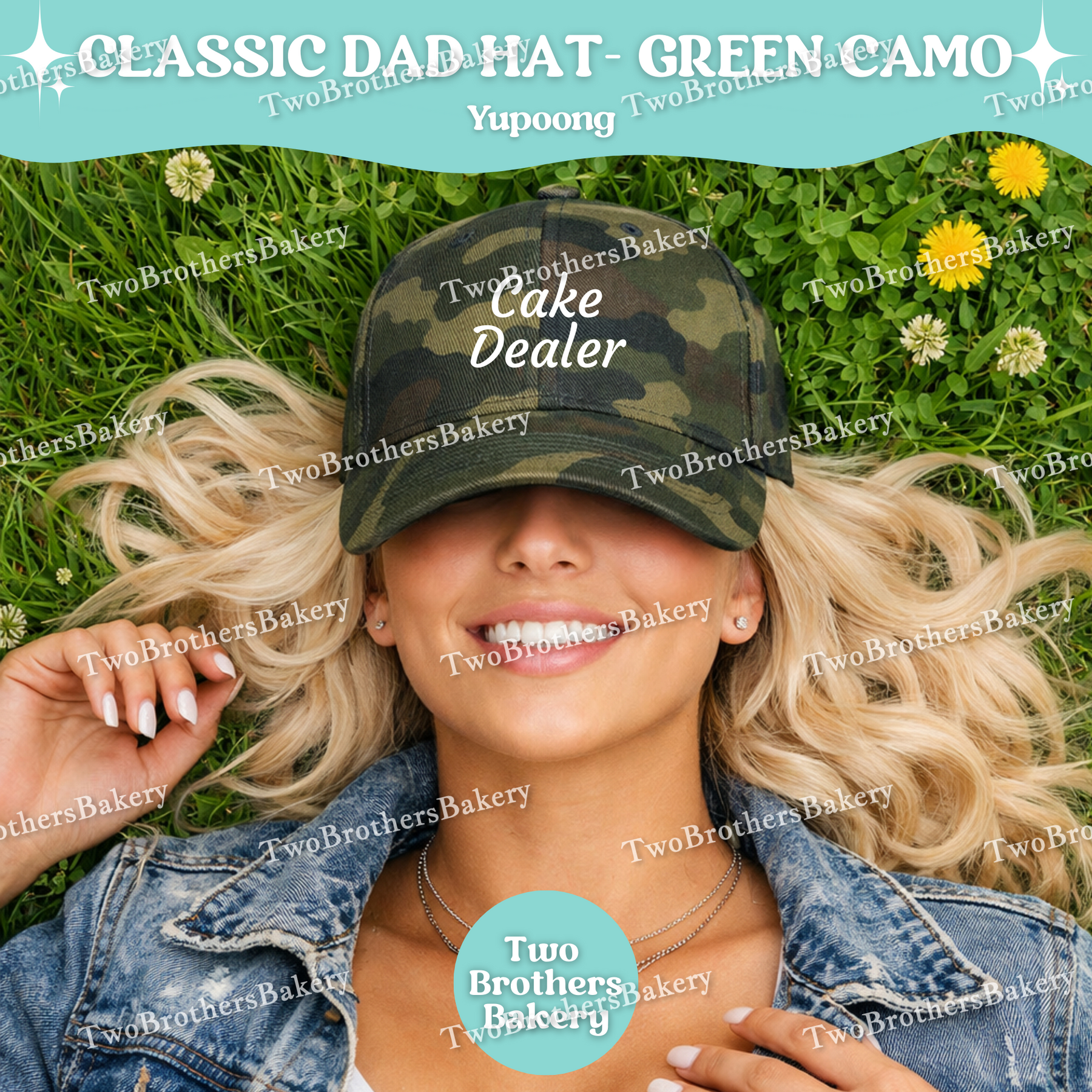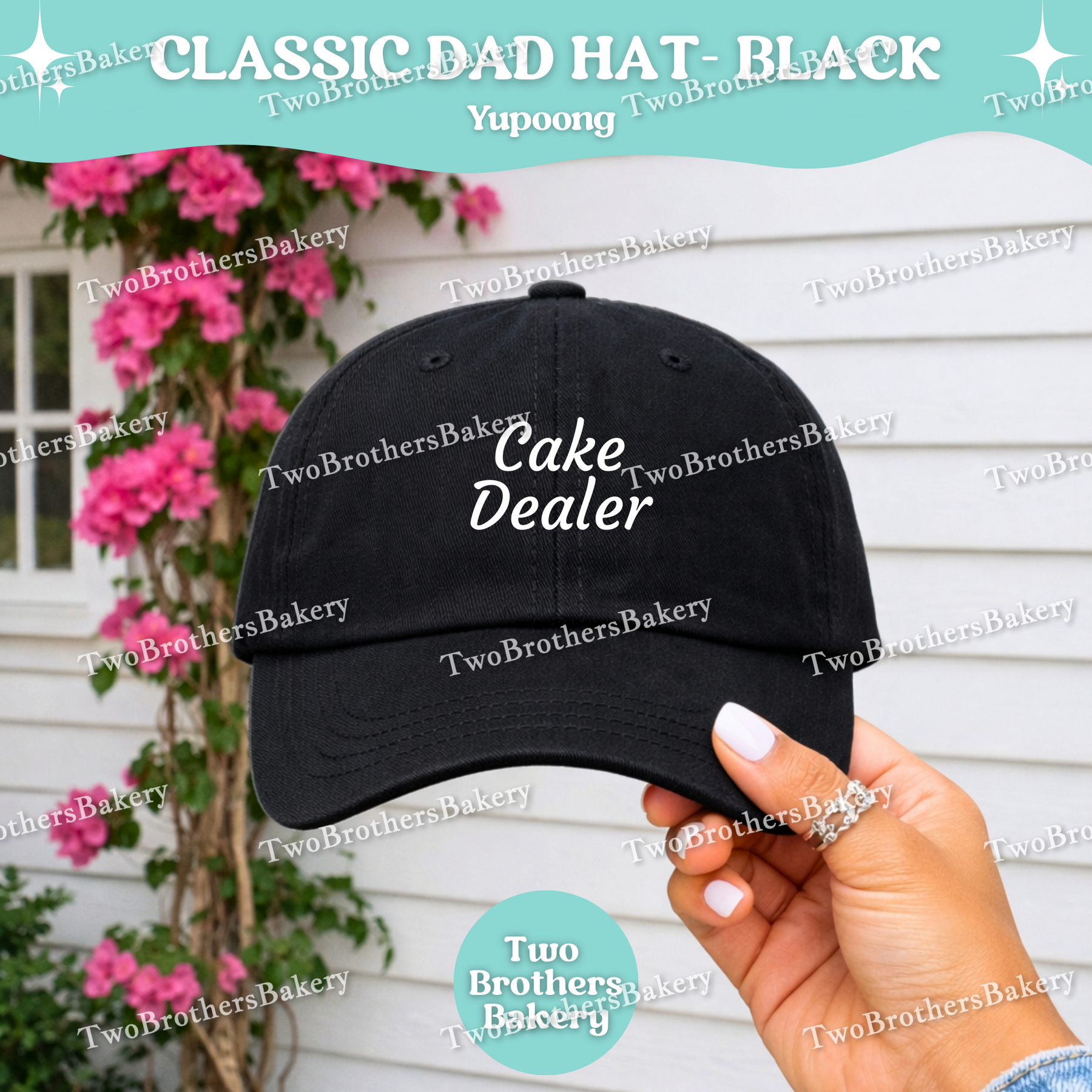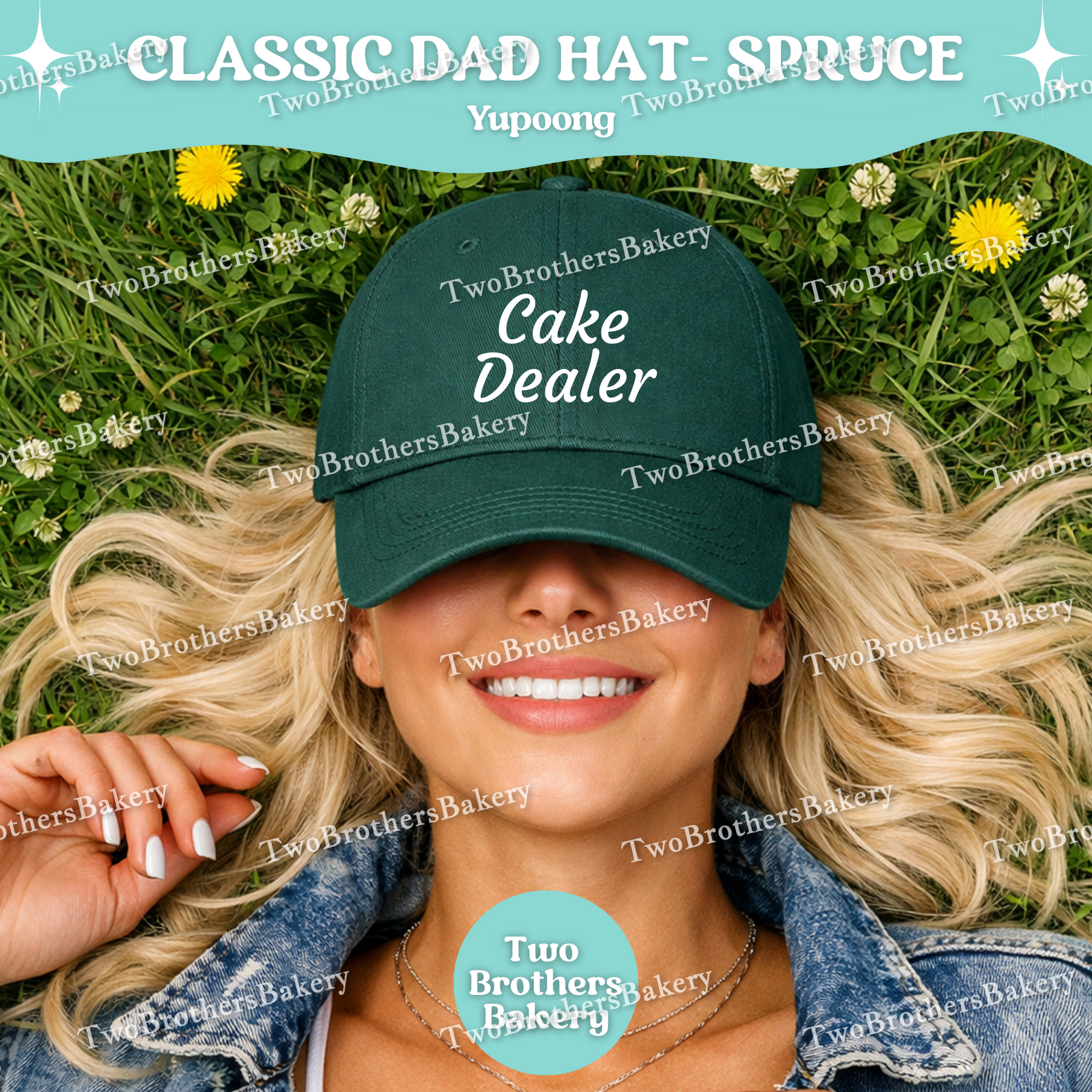 The Cake Dealer design is now featured on the Yupoong Classic Dad Hat in a rich spruce green — the perfect everyday accessory for bakers who are always fully booked and frosting something.