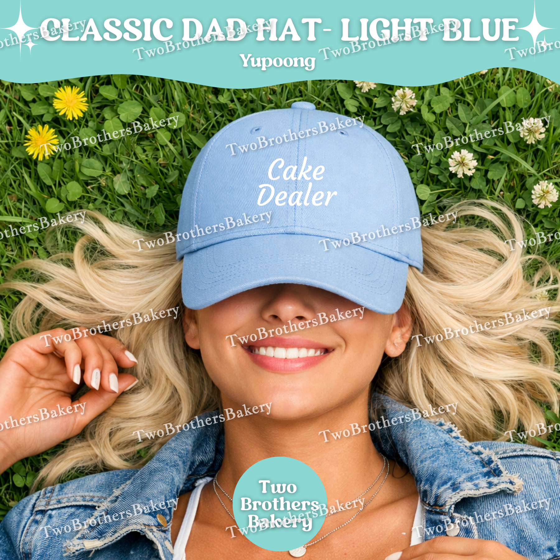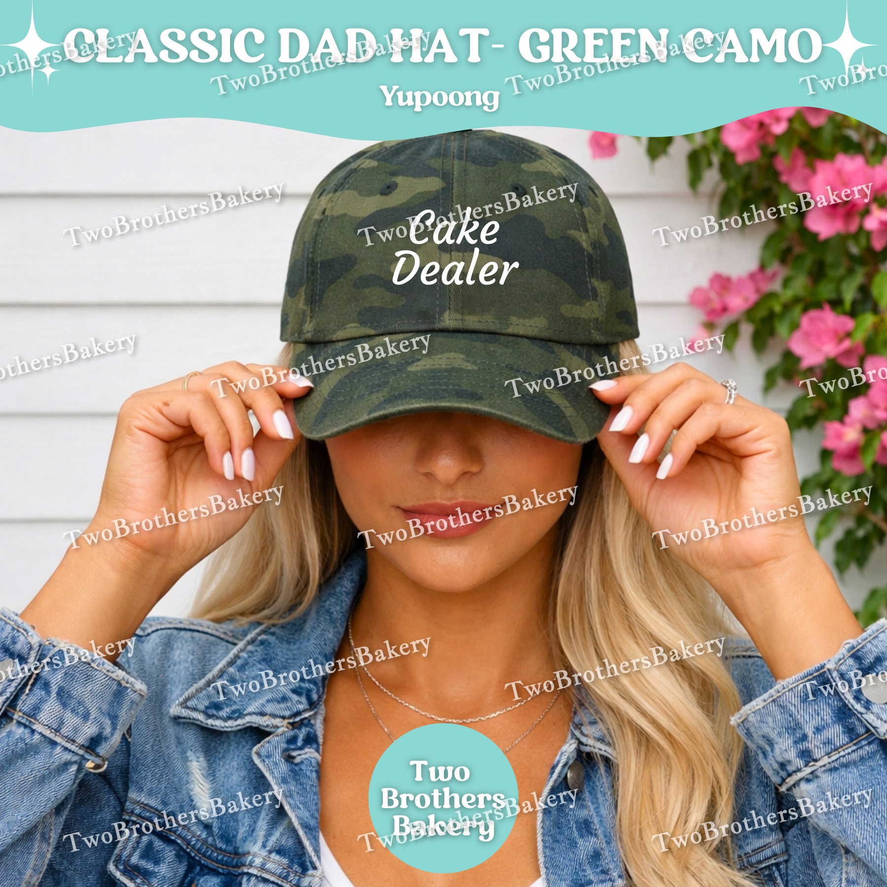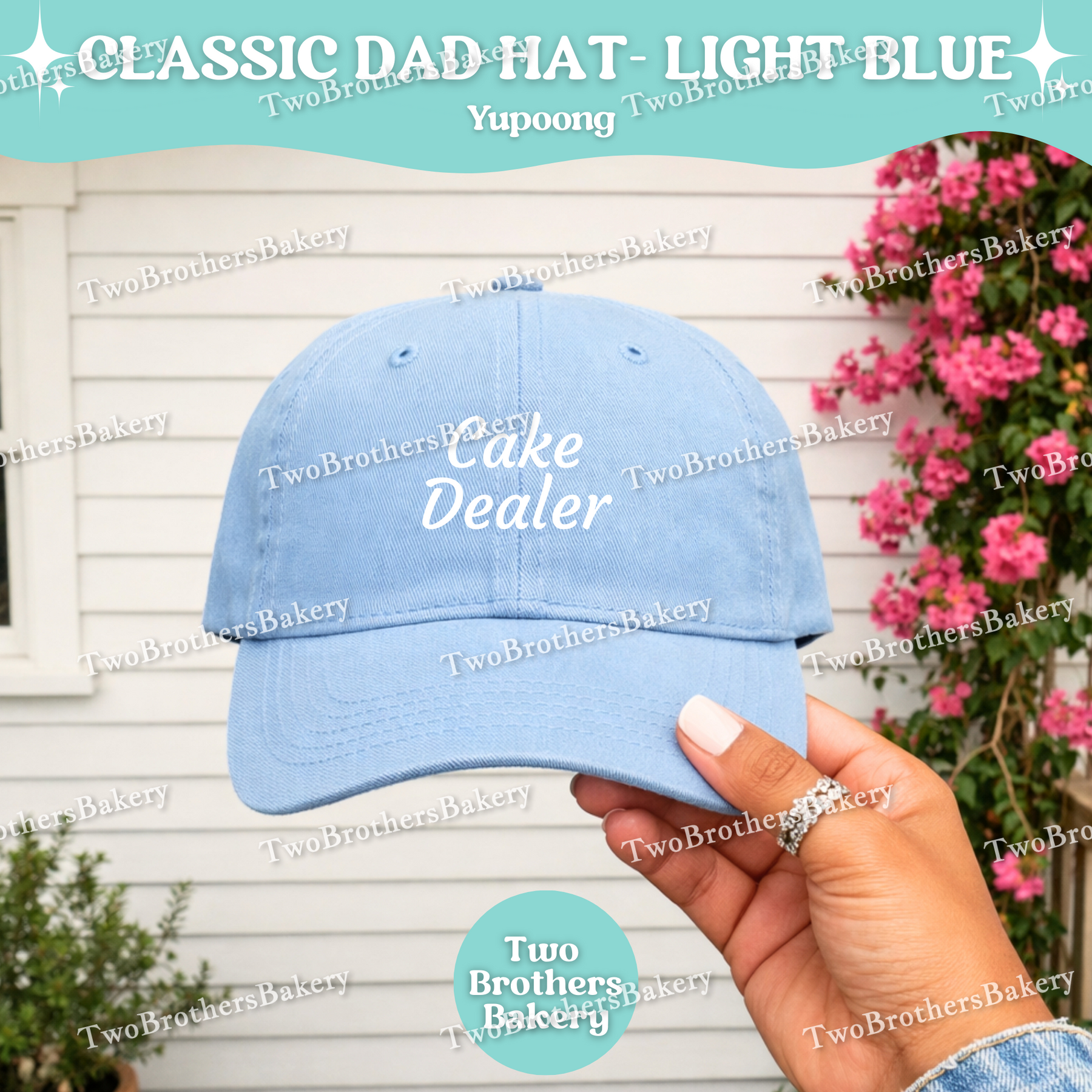 The Cake Dealer design is now featured on the Yupoong Classic Dad Hat in a rich spruce green — the perfect everyday accessory for bakers who are always fully booked and frosting something.