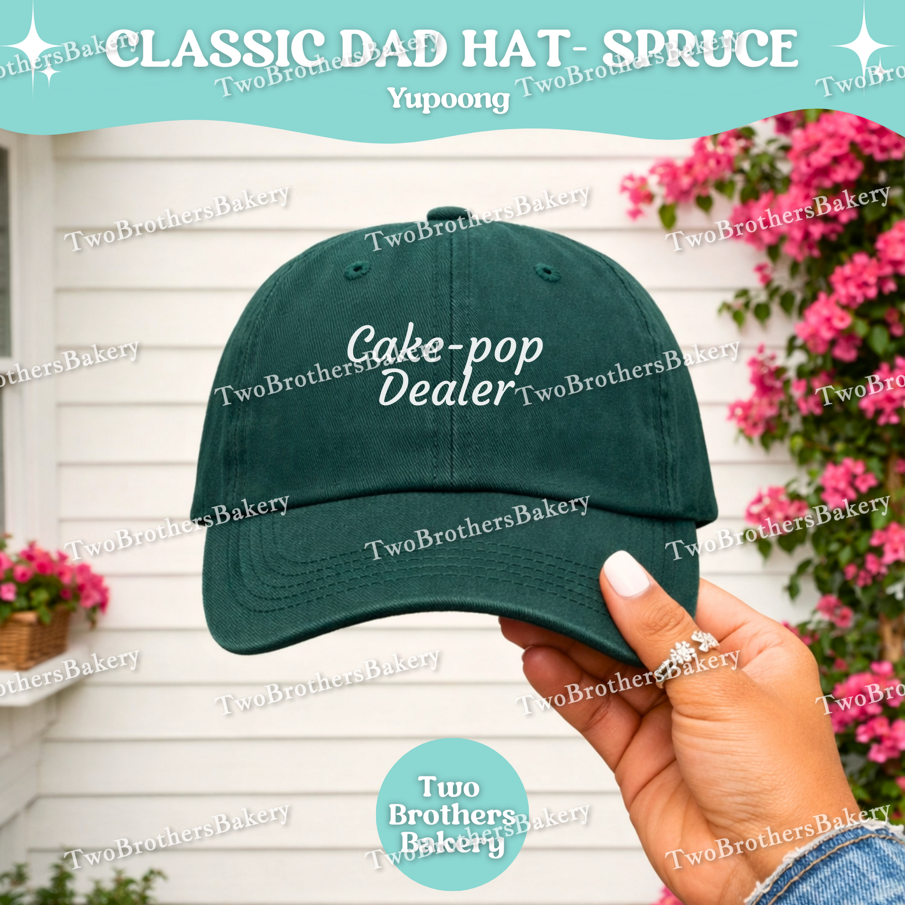 The Cake-pop Dealer design is now featured on the Yupoong Classic Dad Hat in a rich spruce green — the perfect everyday cap for bakers who are dipping, drizzling, and delivering one treat at a time.
