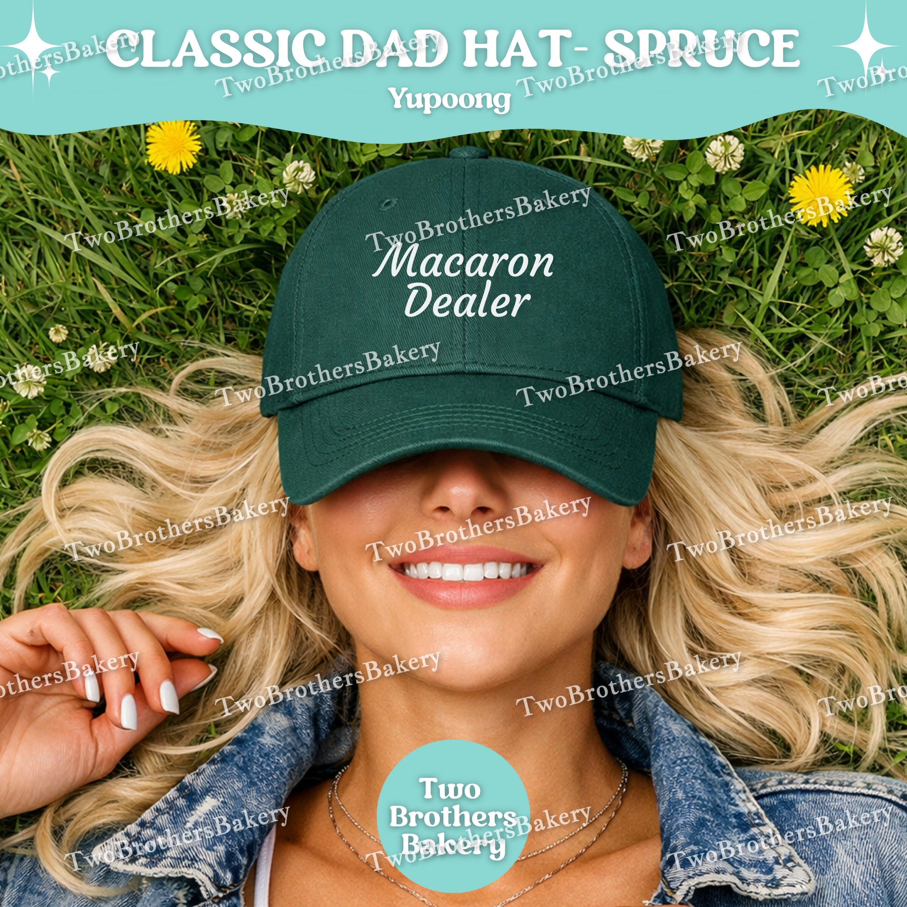 This version is stitched on a Yupoong Classic Dad Hat in a rich spruce green, featuring crisp white embroidery centered on the front. The script-style “Macaron Dealer” gives it that subtle-but-bold energy — playful, confident, and perfect for the baker who knows their macarons are elite.