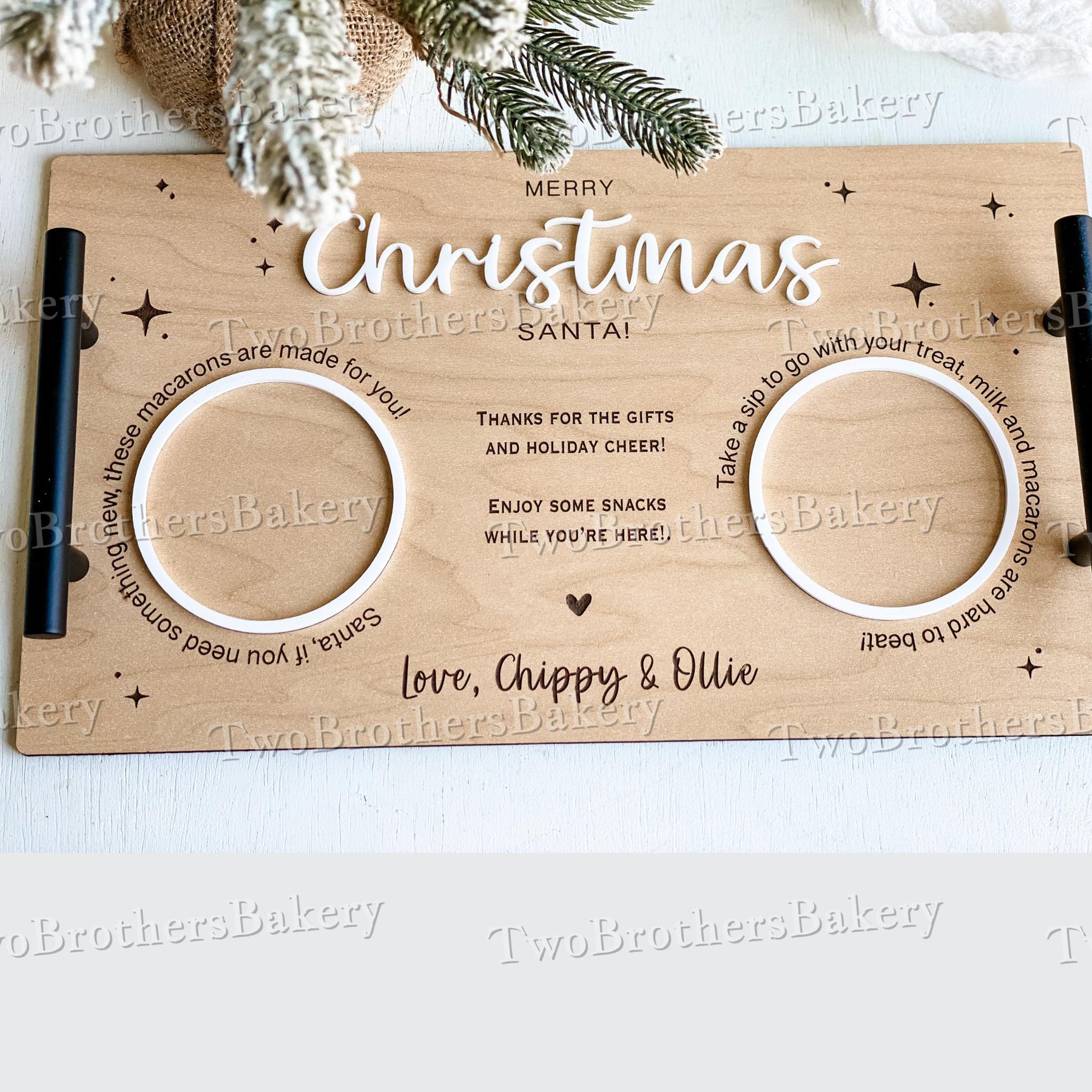 Celebrate Christmas Eve with a sweet macaron twist! This beautifully designed 13.5x8-inch wood tray with black metal handles is perfect for little hands to carry and place out for Santa. Featuring a charming combination of engraved and acrylic elements, this tray adds a festive and personal touch to your holiday traditions.