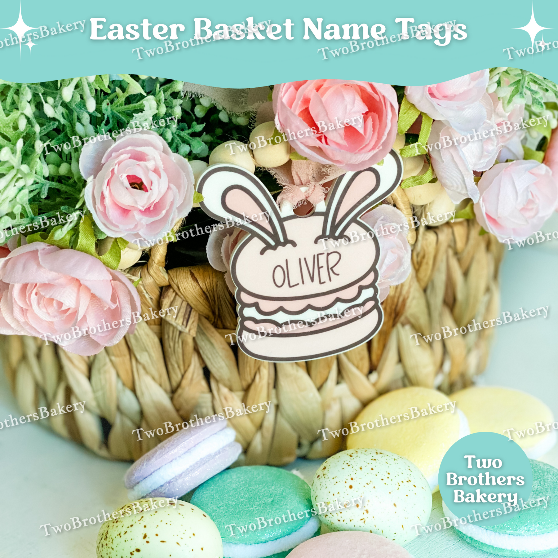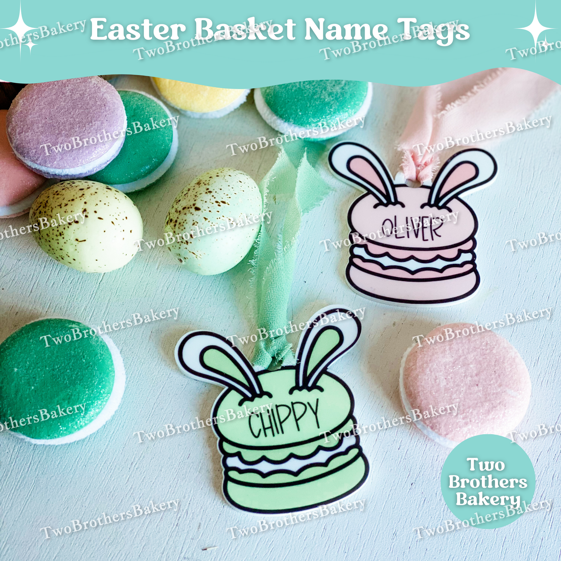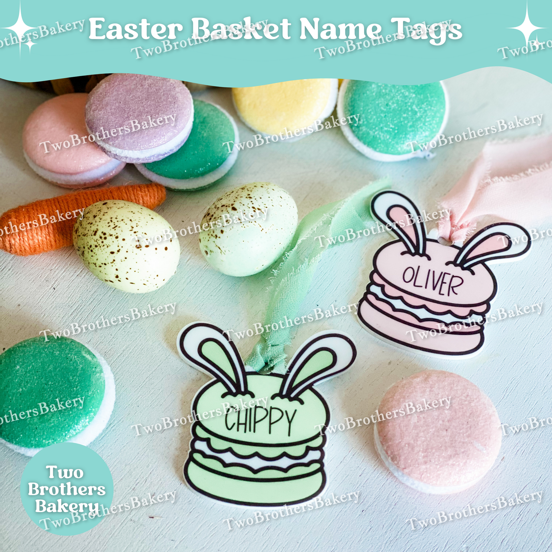 Add a little Parisian sweetness to Easter morning with our Macaron Bunny Easter Basket Name Tag – the perfect personalized touch for your little macaron lover. 🐰✨