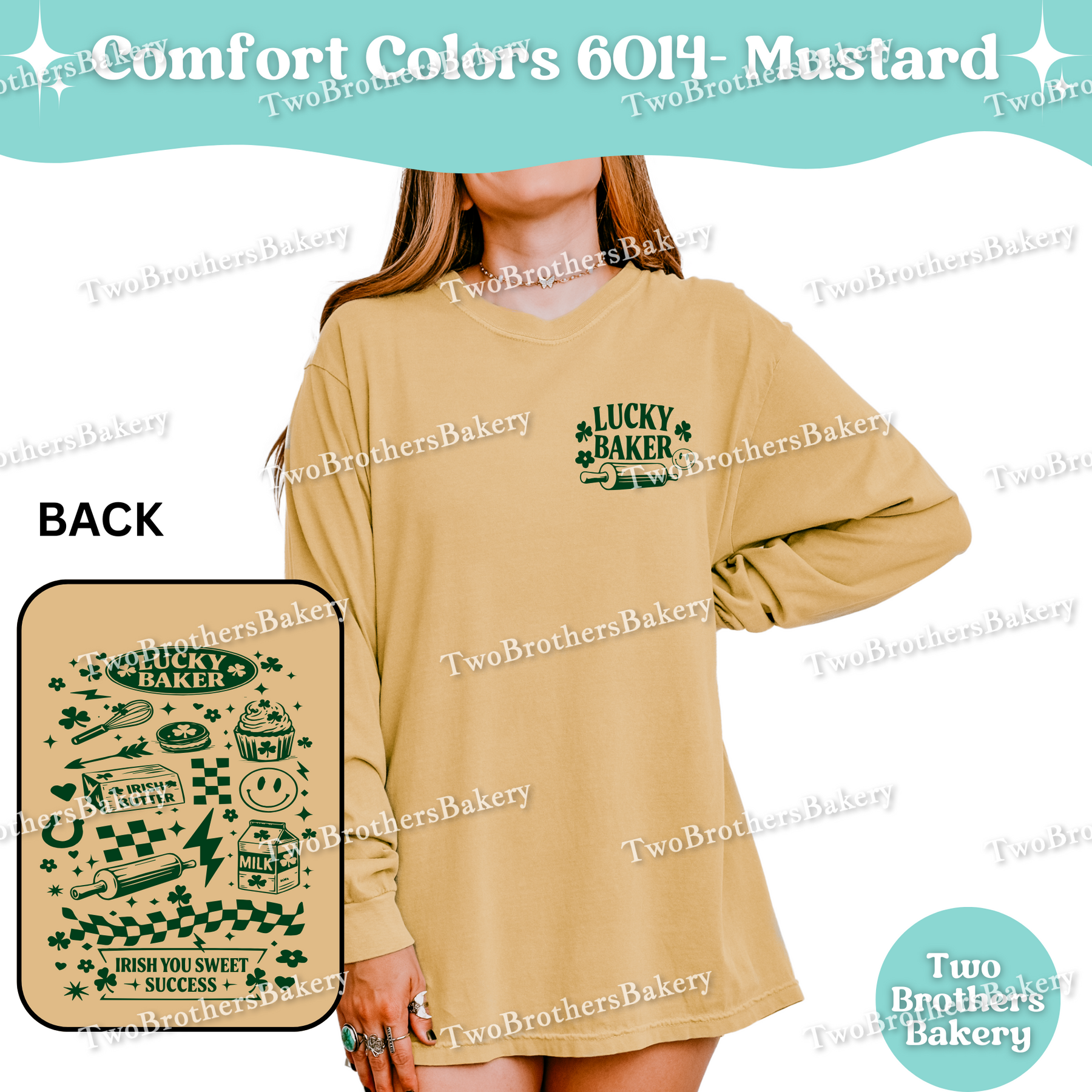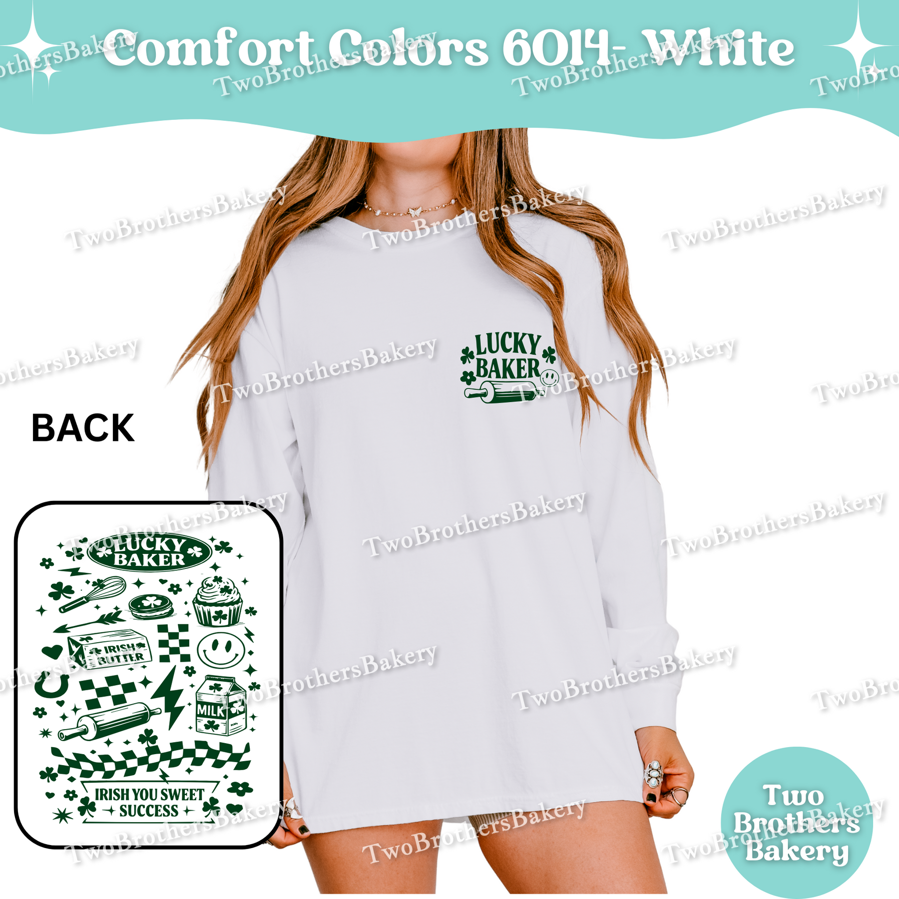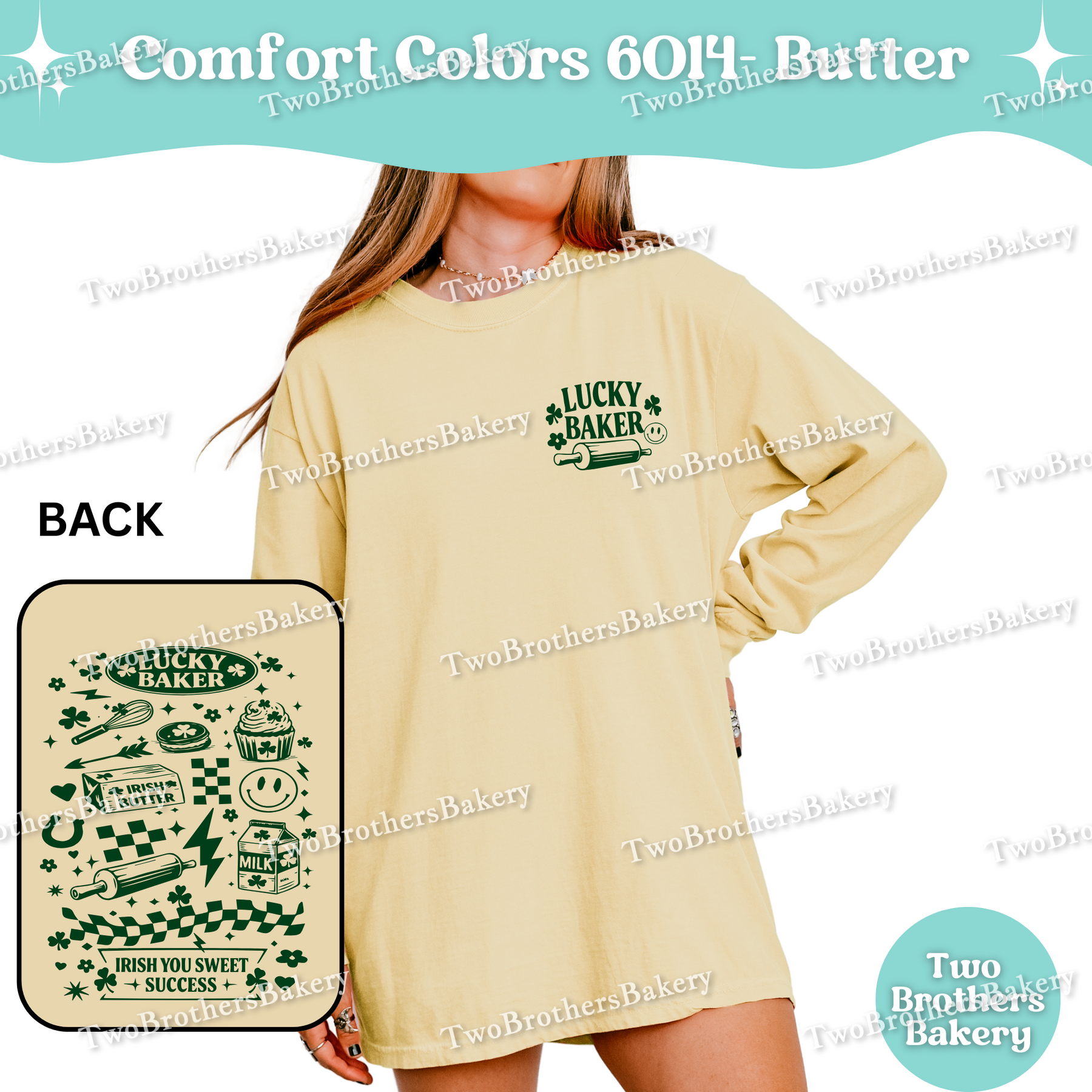 Printed on a Comfort Colors 6014 unisex long sleeve crewneck, this shirt delivers that signature garment-dyed softness bakers swear by. It has a relaxed, lived-in feel that’s ideal for long prep days, farmers markets, pop-ups, or just leaning into cozy kitchen vibes. The front features a smaller pocket-size “Lucky Baker” print, while the back makes a statement with the full illustrated graphic—fun from every angle.