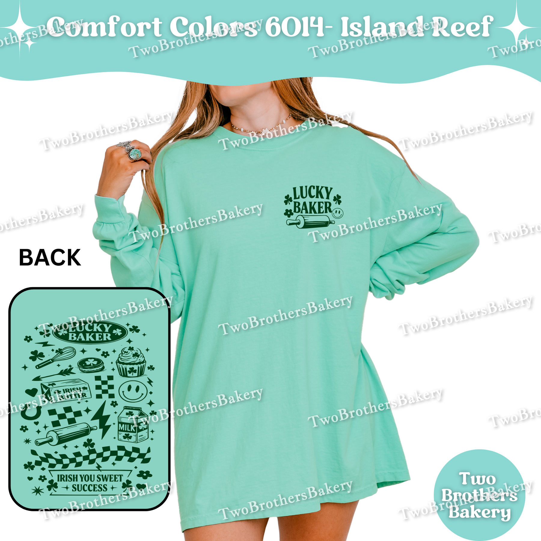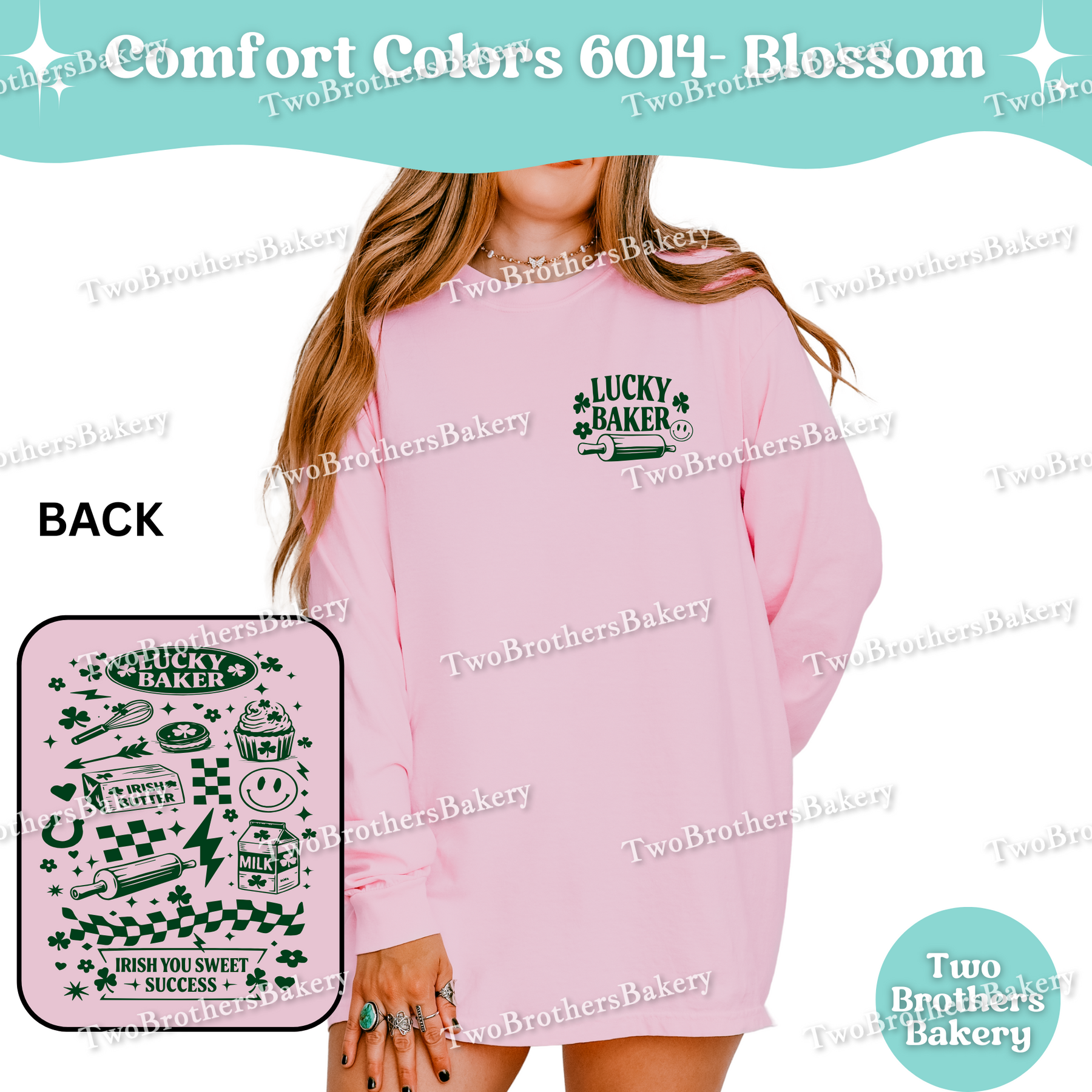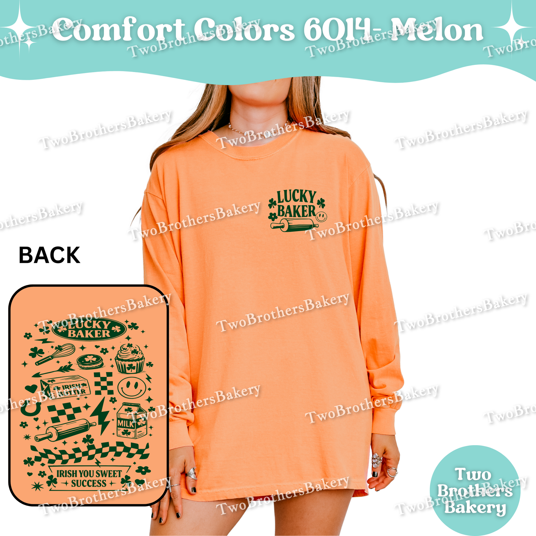 Printed on a Comfort Colors 6014 unisex long sleeve crewneck, this shirt delivers that signature garment-dyed softness bakers swear by. It has a relaxed, lived-in feel that’s ideal for long prep days, farmers markets, pop-ups, or just leaning into cozy kitchen vibes. The front features a smaller pocket-size “Lucky Baker” print, while the back makes a statement with the full illustrated graphic—fun from every angle.