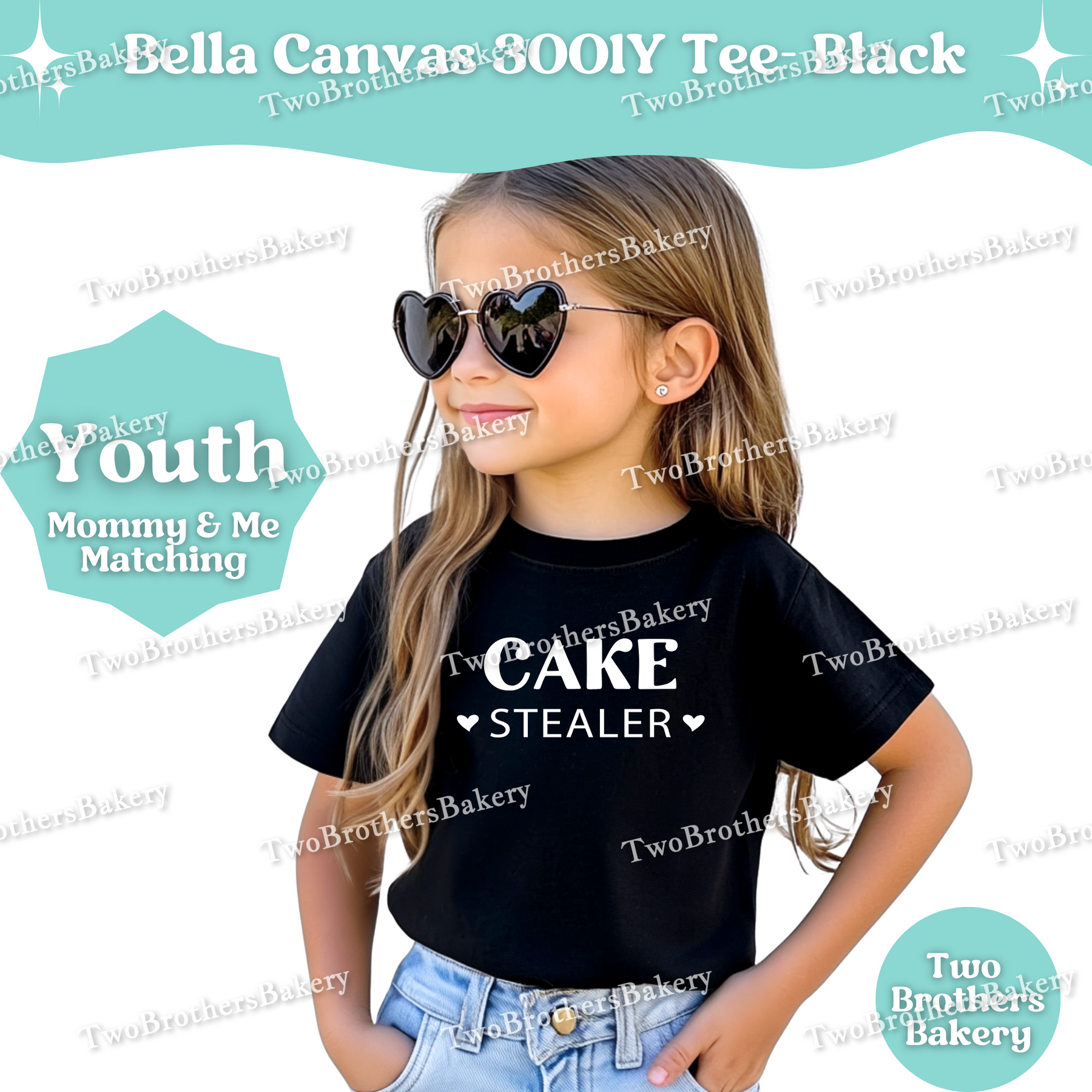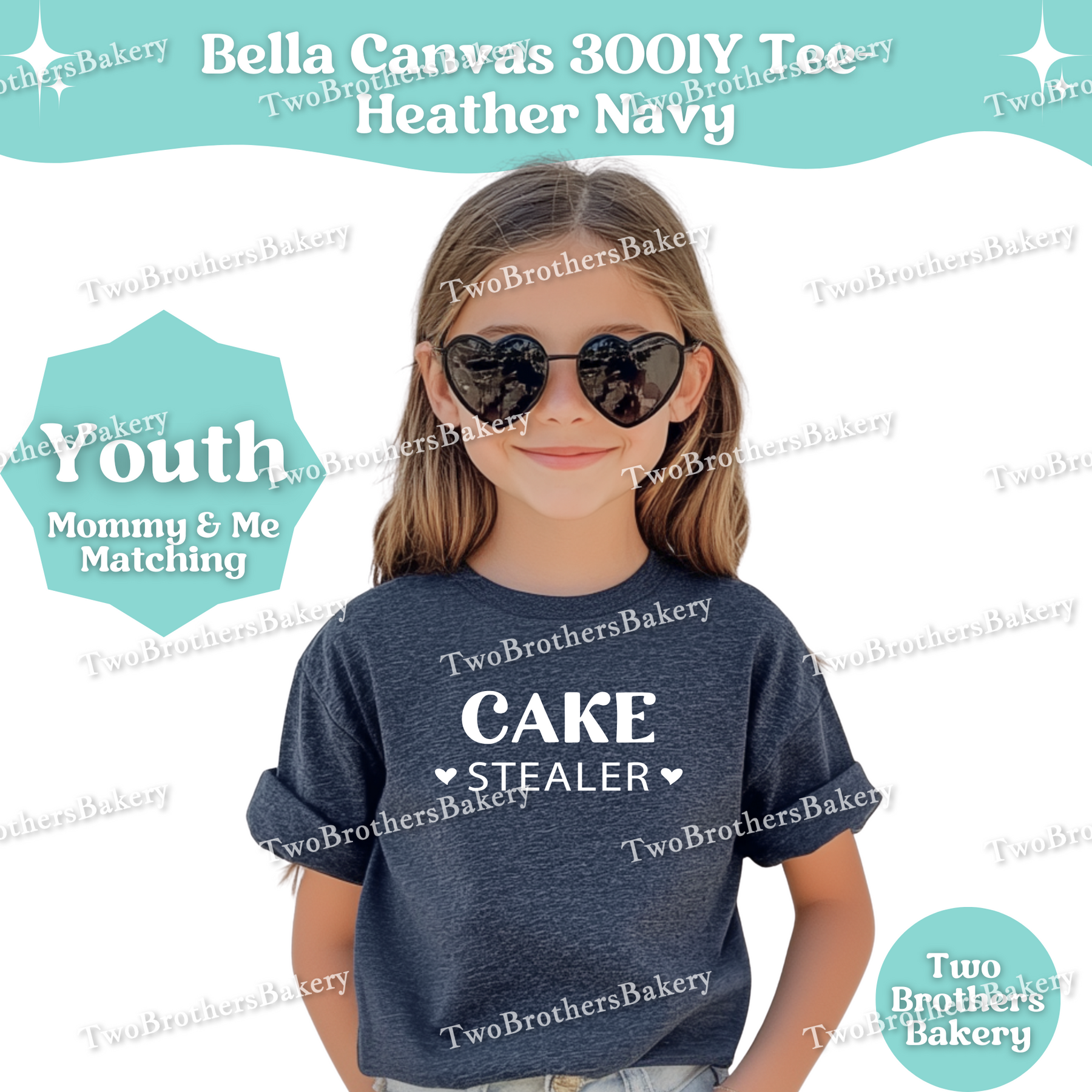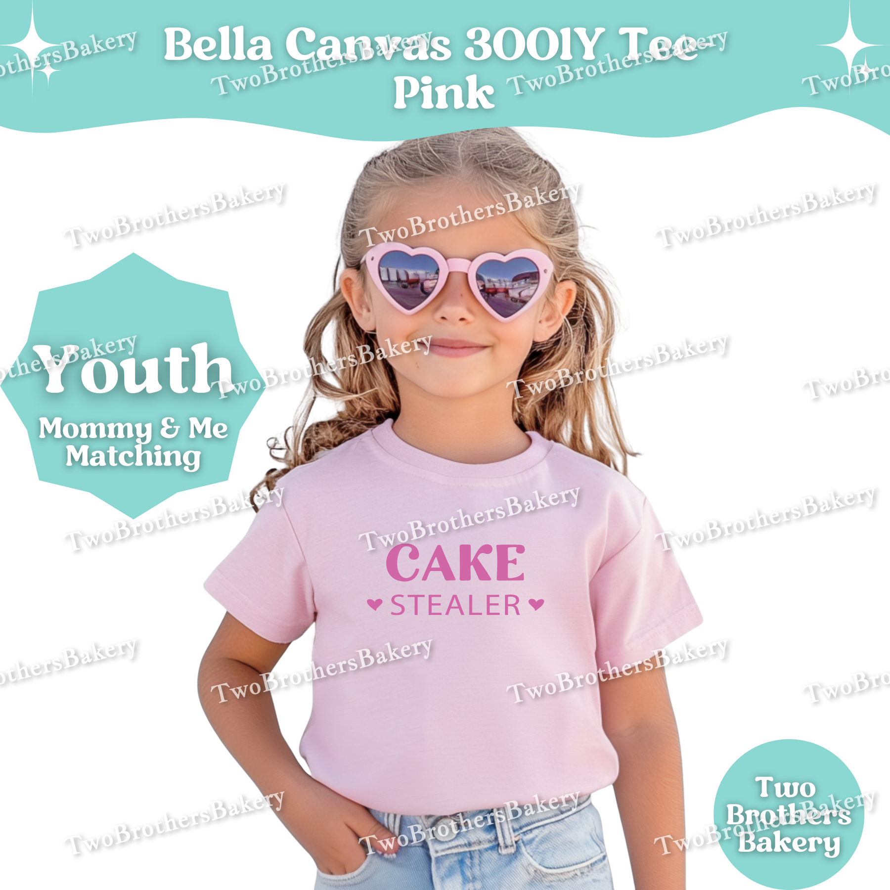 Printed on a Bella + Canvas 3001Y youth tee, this shirt is soft, lightweight, and breathable with a classic unisex fit and crew neckline—comfortable enough for all-day wear, from kitchen helpers to everyday adventures. The Cake Stealer text is printed in either pink or white, depending on the garment color, for a clean, stylish look that pairs effortlessly with any outfit.